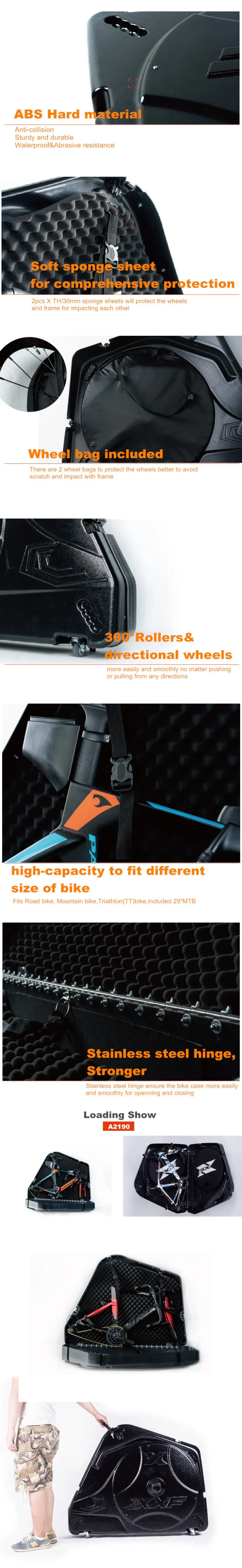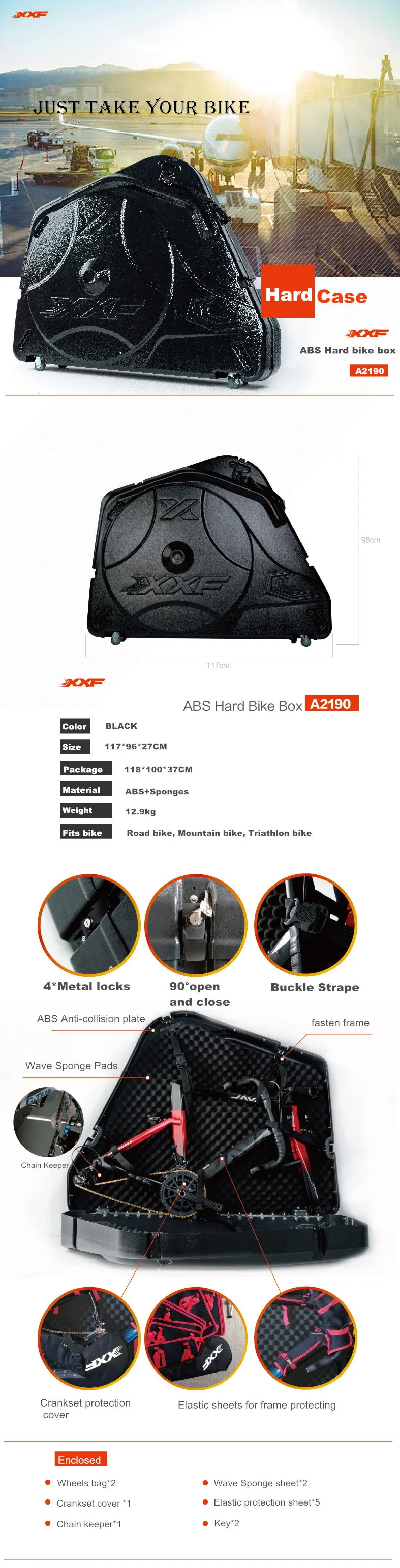 Основная информация о товаре: Бренд: XXF Название: ABS жесткий чехол для велосипеда Модель №: A2190 Цвет: черный Материал: АБС-пластик + подкладка губка Размеры: 117*96*27 см Посылка Размеры: 118*100*37 см Вес нетто: 12,9 кг Посылка Вес: около 16 кг Особенности: 1. XXF велосипед коробка сделана из 5 мм HDPE материала, tames даже самые разрушительный авиационный багаж и системы доставки, чтобы доставить ваш велосипед в целости и сохранности. 2. Велосипед прочный и безопасный в XXF чехол для велосипеда. После транспортировки вы никогда не обнаружите никаких небольших повреждений. 3. Чехол для велосипеда использует прочные замки из нержавеющей стали, крепкие. 4. Он оснащен жесткой пластиковой коробкой ABS, водонепроницаемой, абразивной стойкостью, ударопрочностью, термостойкостью, низкой температурой и хорошим сенсорным ощущением. 5. Коробка включает в себя два колеса сумки, с 2 360 ° универсальные колеса, которые являются более гибкими, съемные ручки. 6. Профессиональный дизайн для веса светильник и большинства размеров велосипедов. 7. Подходит для 26', 27,5 '29 ''горный велосипед, 700C дорожный велосипед, включая XC, DH, интегрированный Подседельный штырь и двойные подвесные велосипеды. В комплекте: Велосипедная коробка * 1 Сумка на колесиках * 2 Волнистая губка Защитная Прокладка * 2 Крышка шатуна * 1 Эластичные листы для рамки * 5 Держатель цепи * 1 Ключ * 2