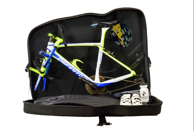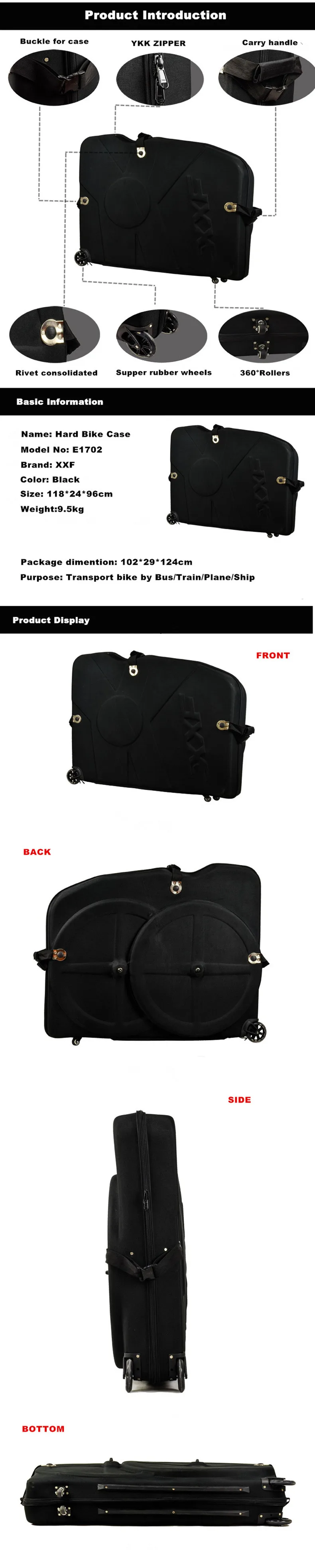 Модель №: E1702 Название: EVA чехол для велосипеда Бренд: XXF Цвет: черный Материал: ЭВА (этиленвинилацетат) Размеры: 118*25*100 см Посылка Размеры: 124*29*102 см Вес нетто: 10,5 кг Посылка Вес: 14,5 кг Особенности Чехол образован эва под 200 градусов тепла, толщина поверхности 1 см, а твердость (Hs) до 80. Это высокая ударная прочность и хорошая стойкость к разрыву и истиранию. Толстый губчатый слой защитит колеса и раму для воздействия друг на друга, различные прочные пряжки и ремни для защиты деталей велосипеда для дополнительной безопасности, никогда не беспокойтесь, что они выпадут во время транспортировки. Конструкция «clame Shell» позволяет полностью Открыть чехол для удобства размещения велосипеда. Передние 2 360 обезжиренные вращающиеся колеса и задние супер резиновые колеса, которые могут быть горизонтальным толканием; это более плавно и расслаблено для переноски. Сильный. Интегрированная прочность YKK молний и резервное копирование по quick release элегантные и удобные в использовании. Подходит для 26', 27,5 ', 29 ''горного велосипеда, 700C шоссейного велосипеда и интегрированного сиденья велосипеда.