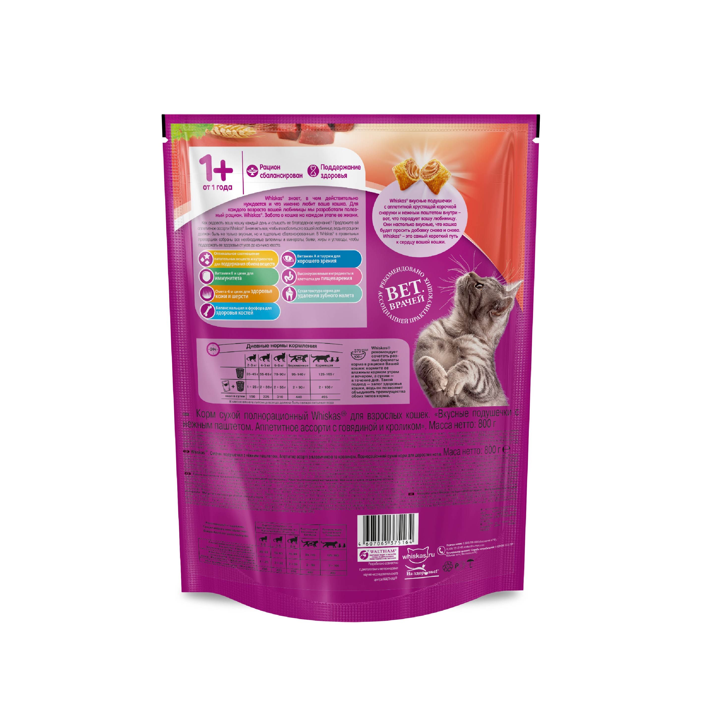 Сухой корм для кошек Whiskas Вкусные подушечки с нежным паштетом, Аппетитное ассорти с говядиной и кроликом, 800г