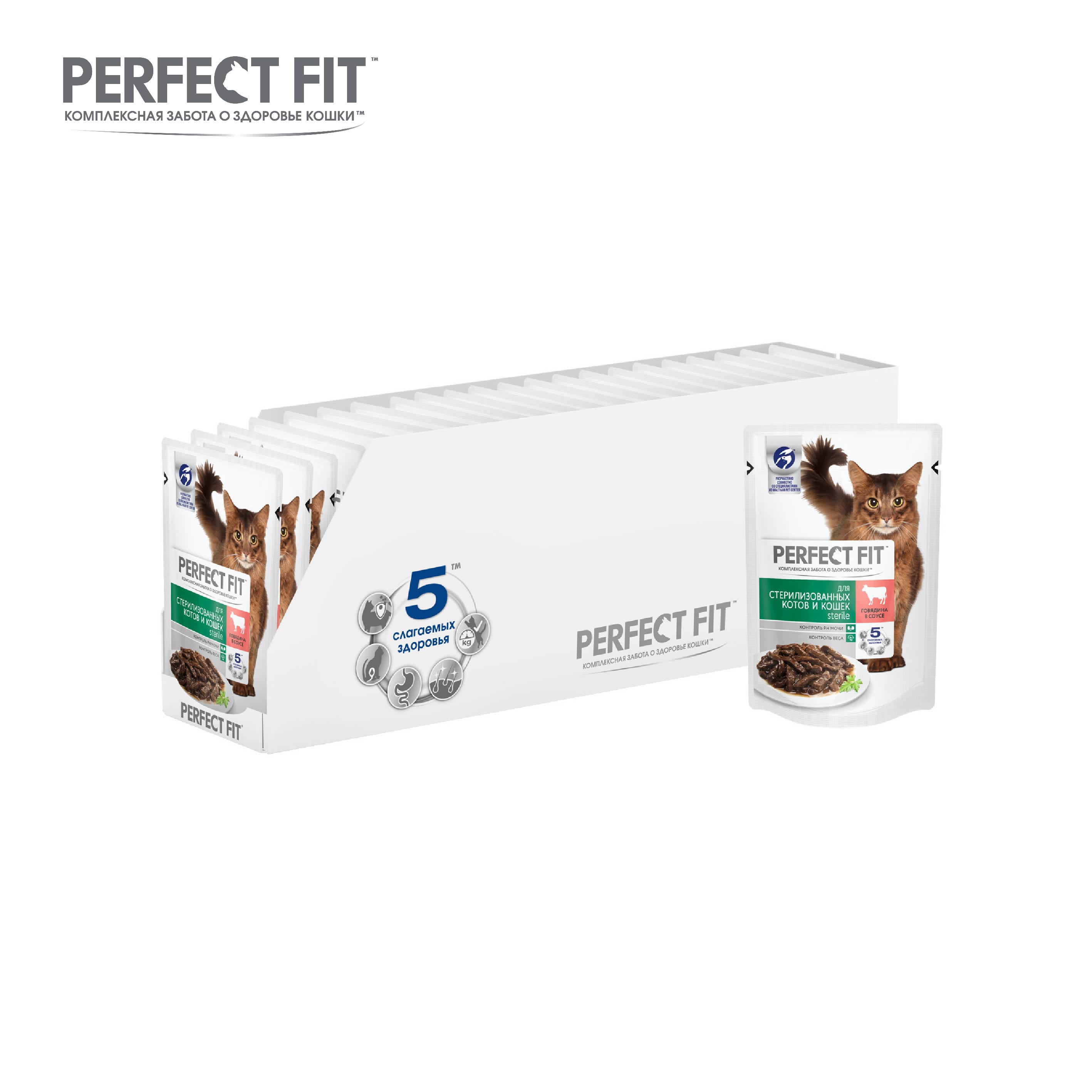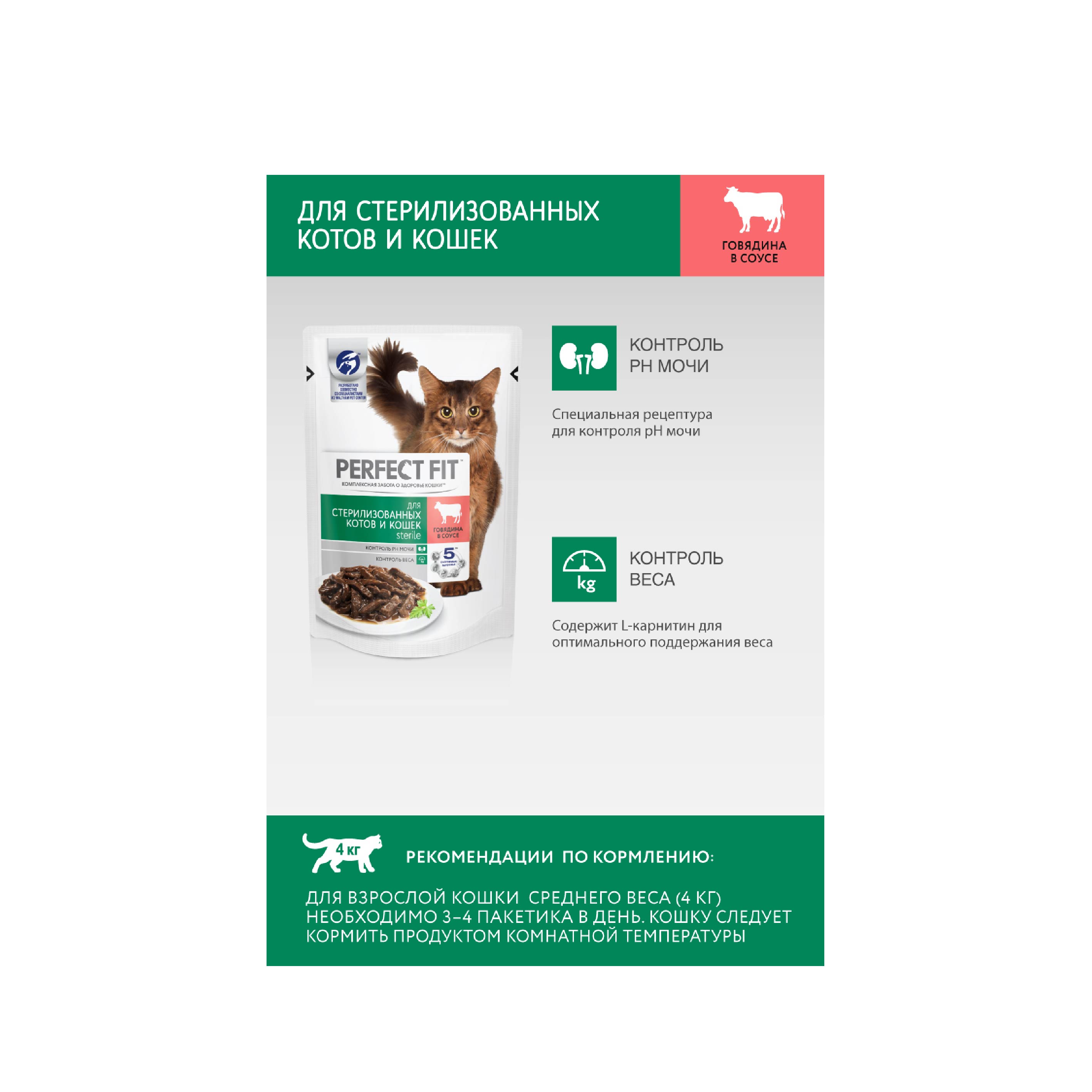 Влажный корм в паучах PERFECT FIT™ Sterile с говядиной в соусе для стерилизованных кошек разработан по специальной рецептуре для контроля здоровья кошек, прошедших стерилизацию. Контроль рН мочи - Специальная рецептура для контроля рН мочи Контроль веса - Содержит L-карнитин для оптимального поддержания веса Вашу кошку следует кормить кормом комнатной температуры.