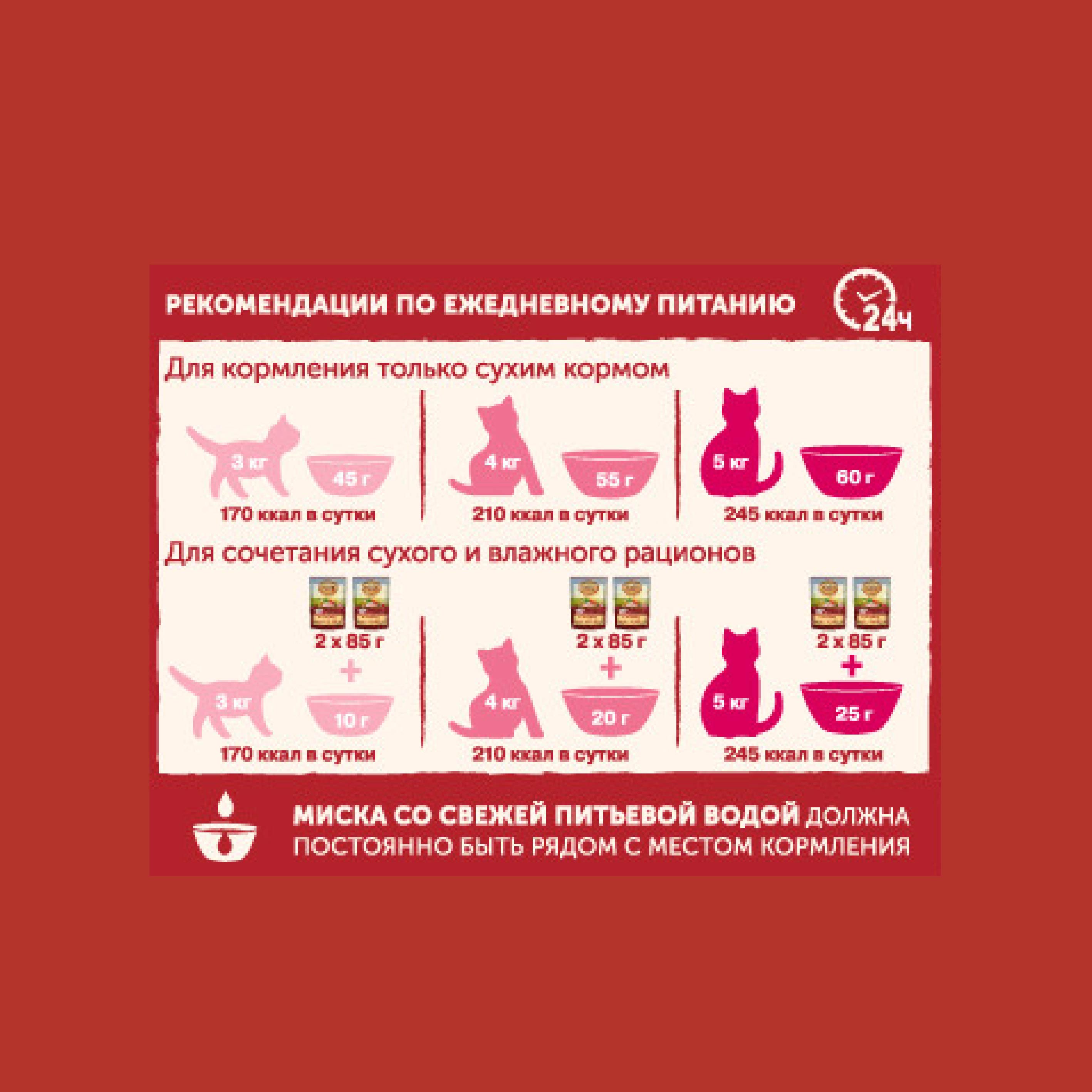 - масса кошки 2-3 кг – 2-3 пакетика; - масса кошки 4-5 кг – 3-4 пакетика; - масса кошки 6-7 кг – 4-5 пакетиков. Кормите вашу кошку кормом комнатной температуры. Миска со свежей питьевой водой должна постоянно быть рядом с местом кормления.