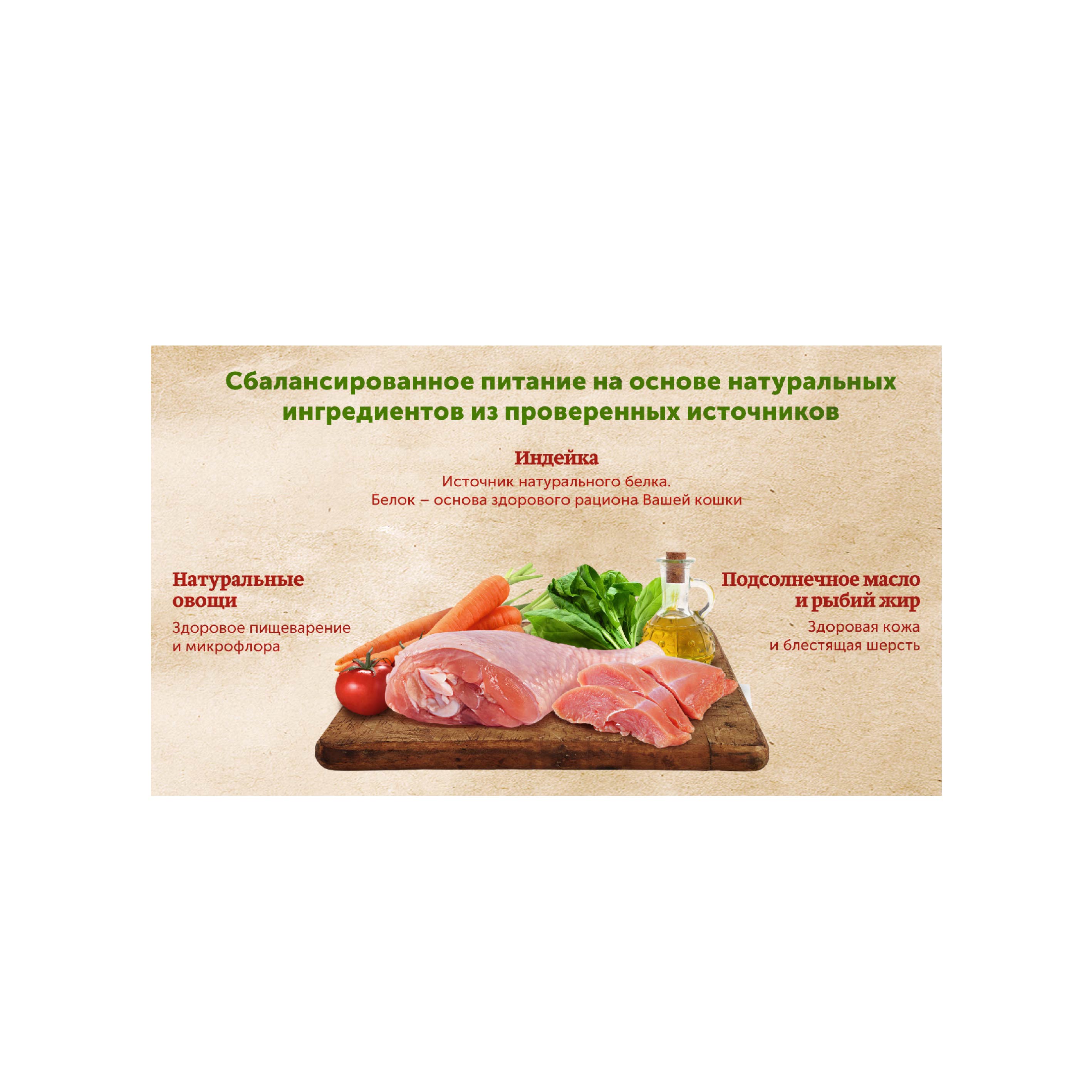 - ингредиент №1 – индейка – источник животного белка с высокой усвояемостью, диетическое мясо, является основой здорового рациона кошки;