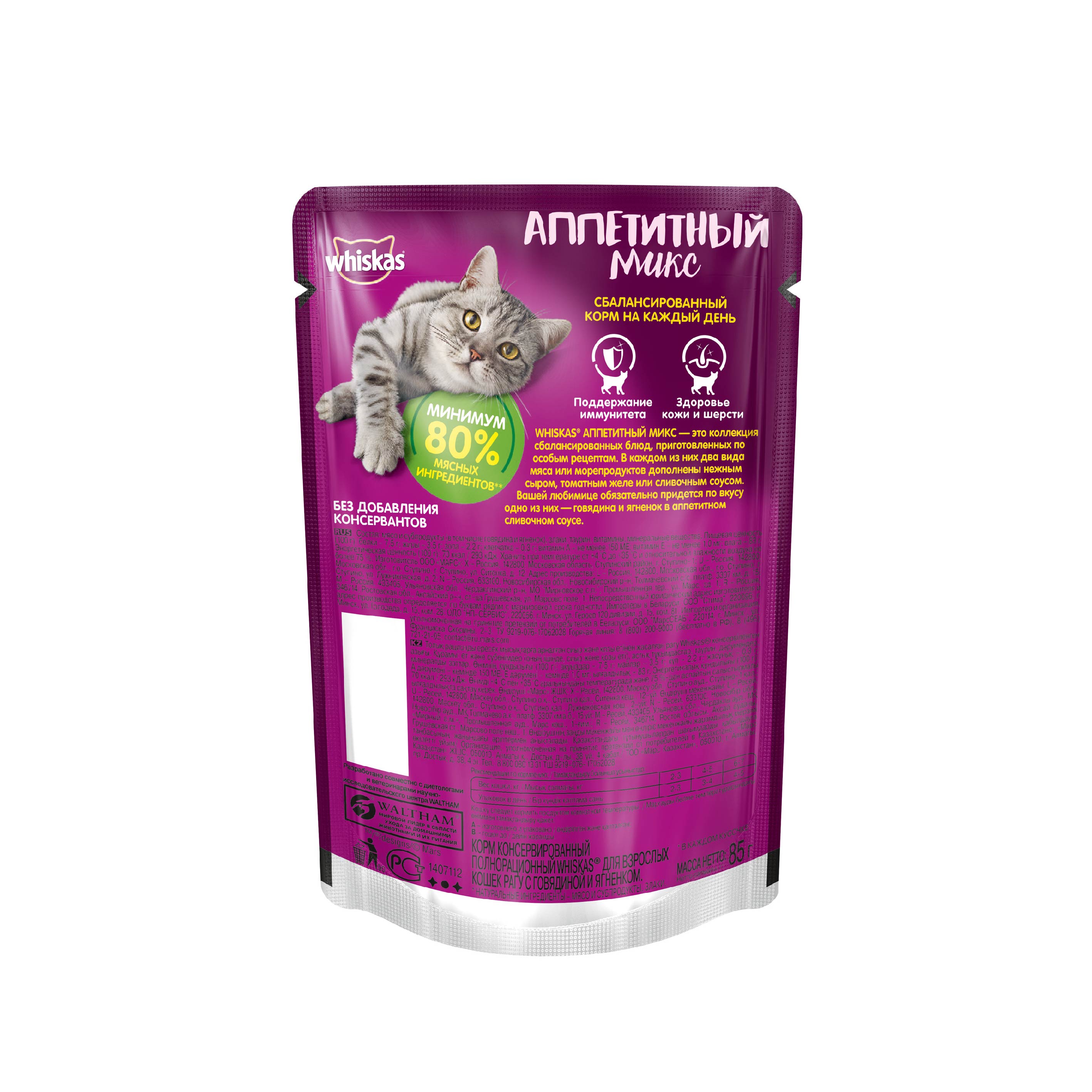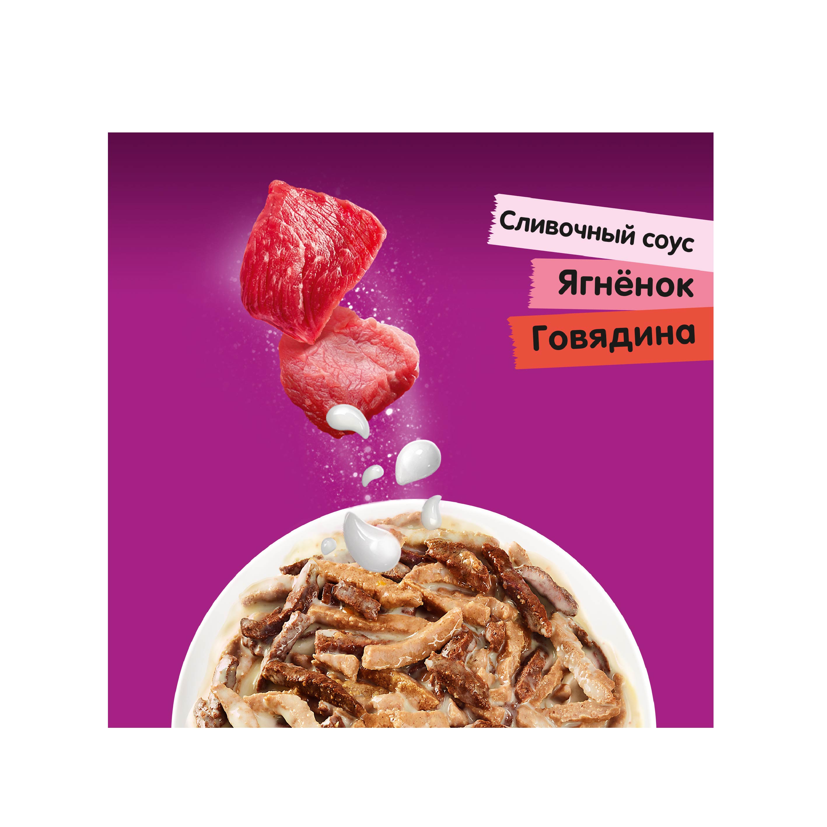 Говядина, ягненок и сливочный соус — сразу всё, о чём мечтала ваша кошка, в новой коллекции сбалансированных блюд WHISKAS® Аппетитный микс.