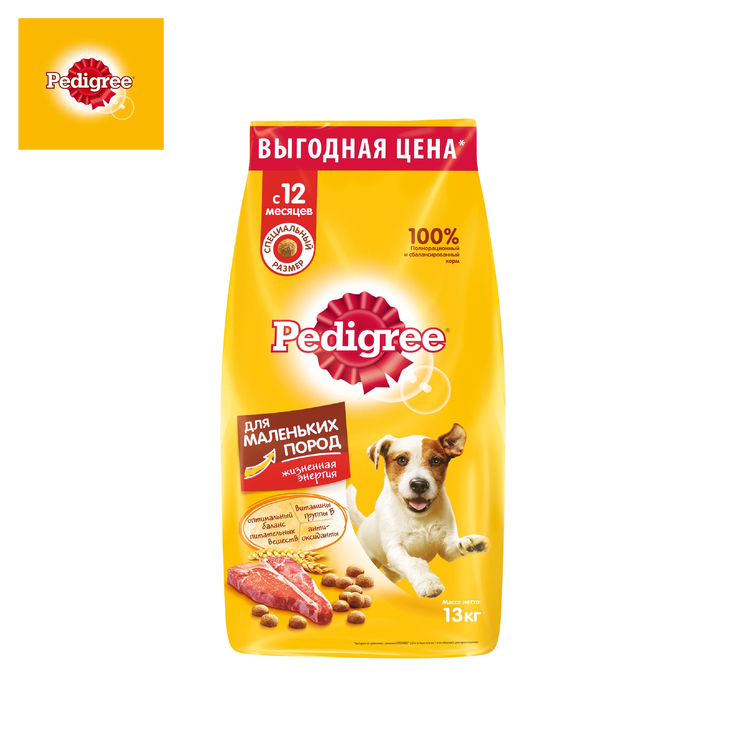 Корм сухой полнорационный Pedigree для взрослых собак маленьких пород меньше 15 кг с говядиной, 13 кг
