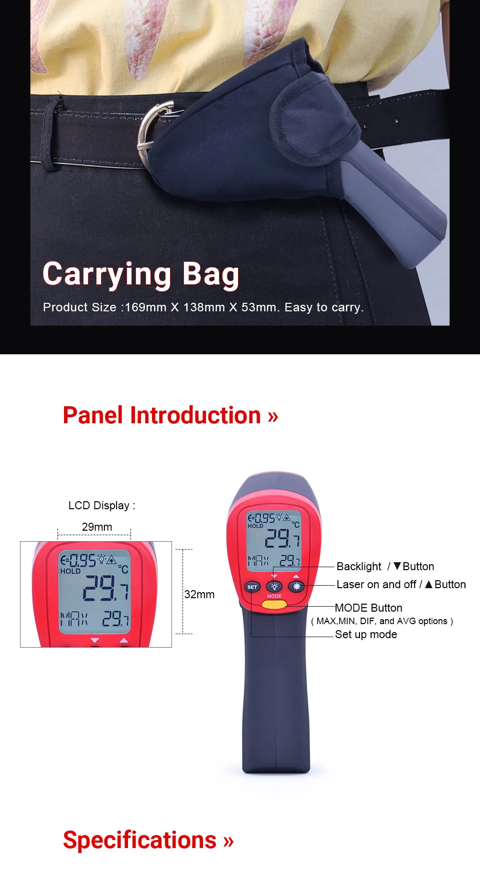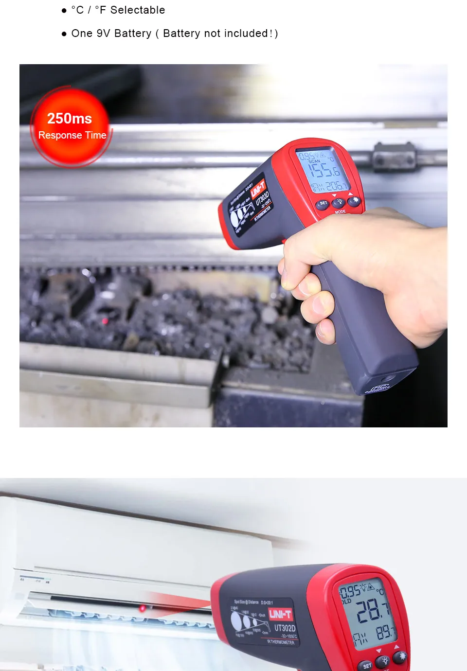 Серия UT303-это профессиональный инфракрасный термометр, который может определить температуру путем тестирования инфракрасной энергии на поверхности объекта. Он имеет различные диапазоны испытаний температуры и относится к 4 моделям. Он применим для управления процессом электрического оборудования, двигателей и системы охлаждения HVAC и для проверки температуры стали, железа, стекла, пластика и цемента производственного процесса. Для применения в железной дороге, он используется для обнаружения температуры валов поезда и устранения неполадок, чтобы предотвратить несчастные случаи в путешествиях.