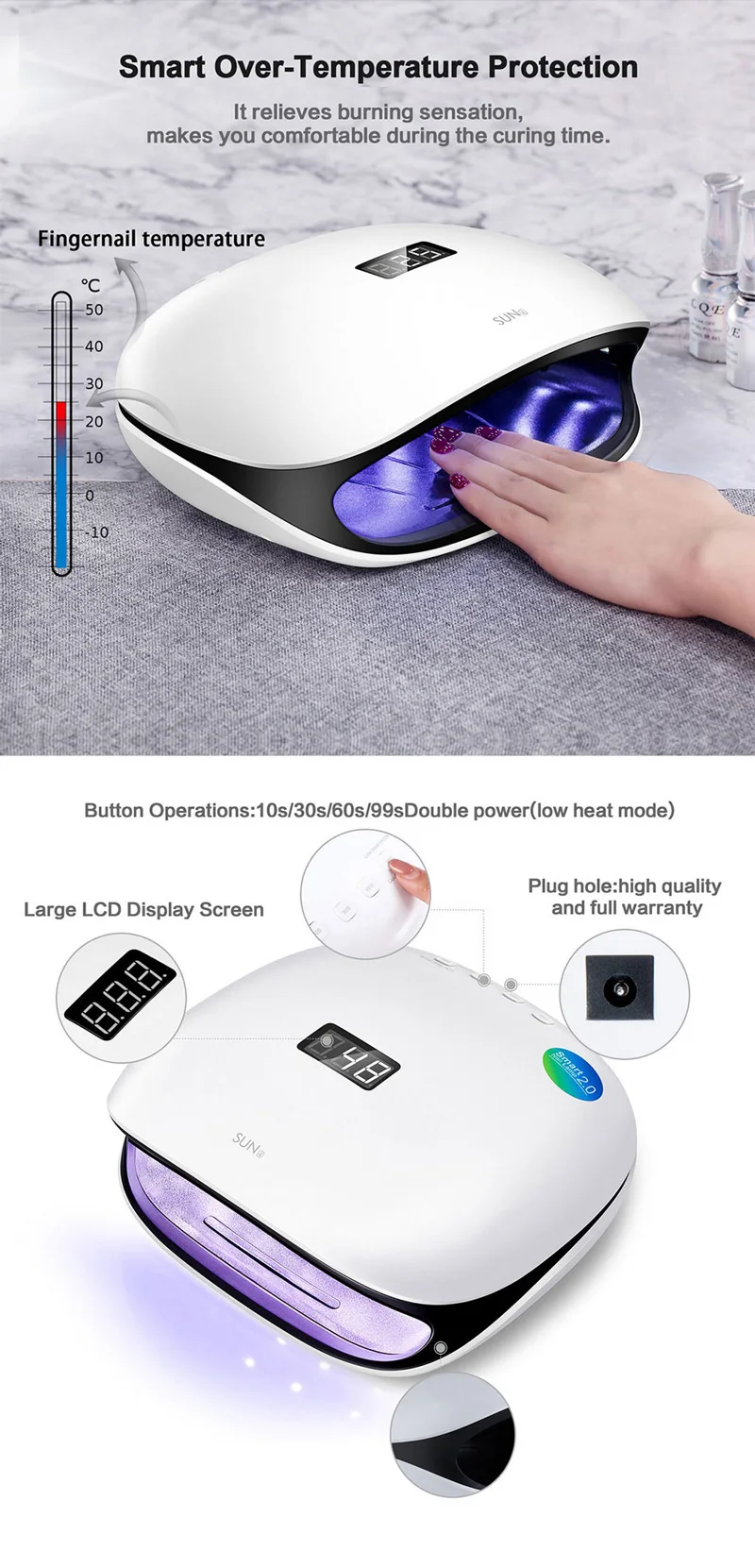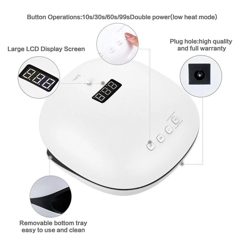 > Высокая мощность 48 Вт для быстрого отверждения > 36 шт. двойной светильник 365nm + 405nm для любых УФ-или светодиодных гелей > 4 настройки таймера: 10s, 30s, 60s, 99s > Умный Цифровой дисплей времени и датчик > Умный безболезненный строитель/отверждение твердого геля > Умная двойная скорость отверждения, функция памяти, защита от перегрева > 50,000Hrs срок службы > Гарантия 1 год