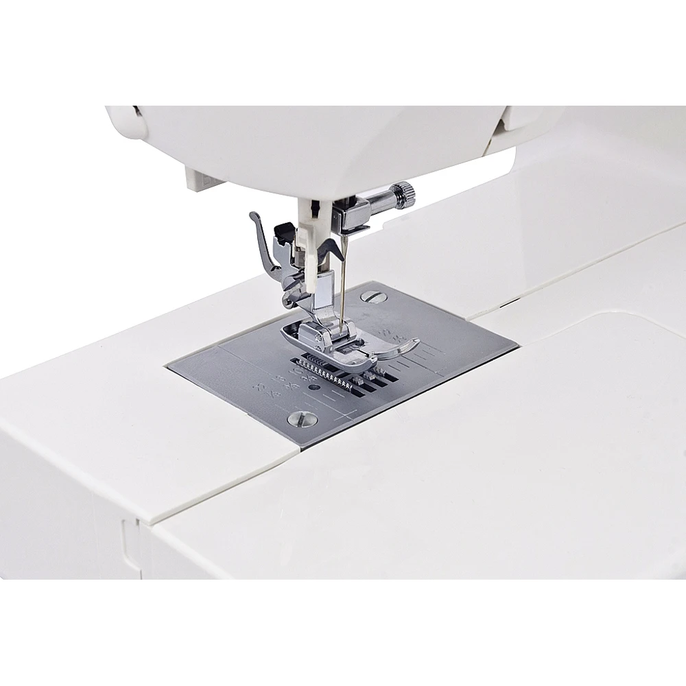 Машина оснащена нитевдевателем и обладает стабилизатором усилия прокола, что очень пригодится при шитье тяжелых материалов и прошивании нескольких слоев.