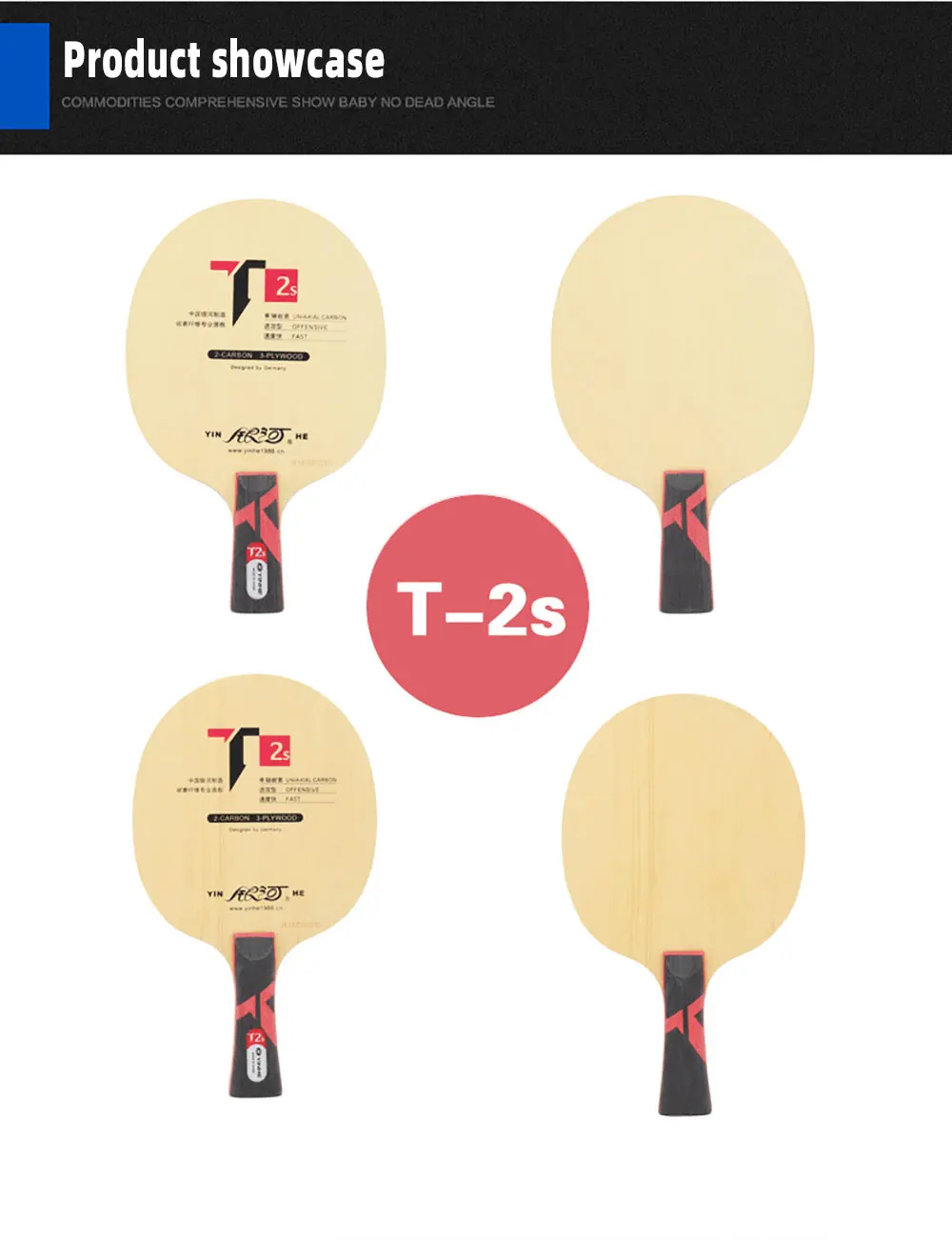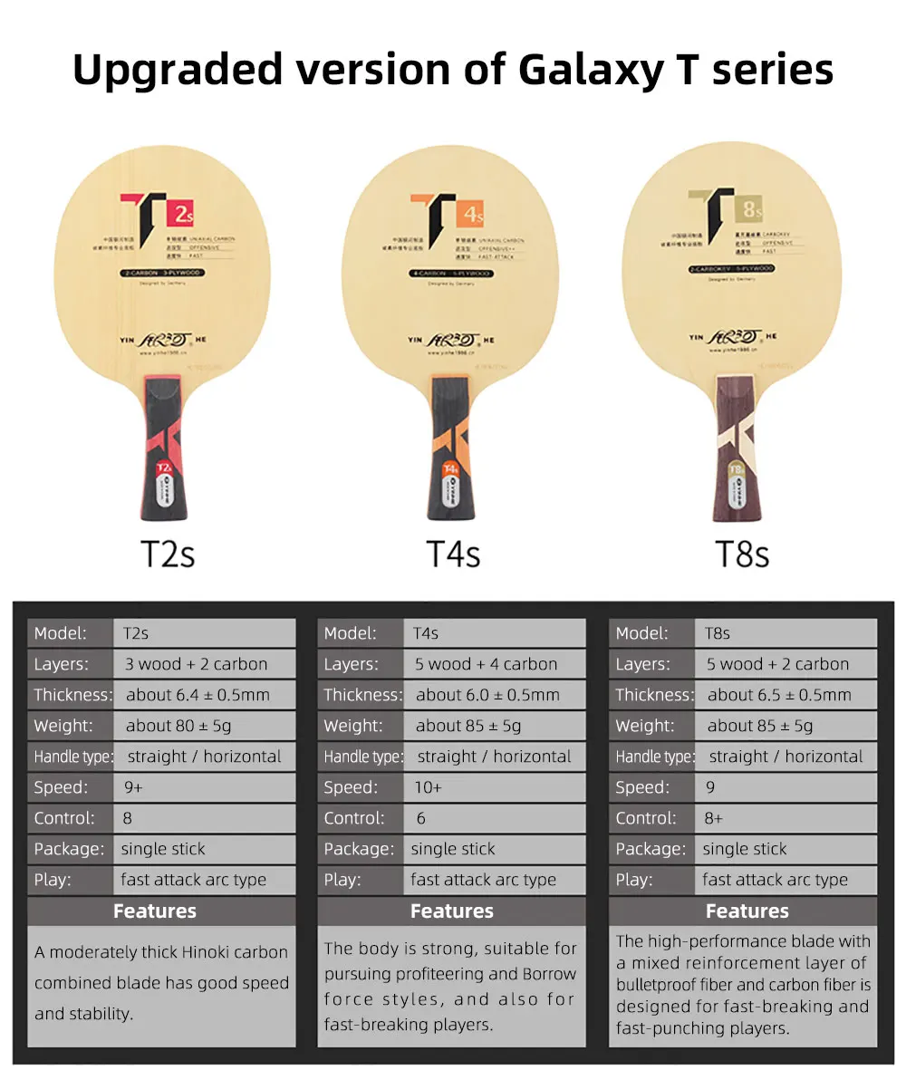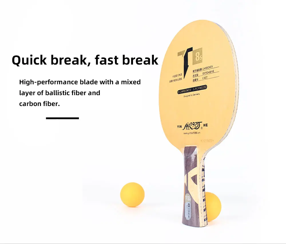 Модель: T4s Слои: 5 дерево + 4 углерода Толщина: около 6,0 ± 0,5 мм Вес: около 85 ± 5g Тип ручки: прямой/горизонтальный Скорость: 10 + Управление: 6 Посылка: одна палка Воспроизведение: тип дуги быстрой атаки Особенности: тело прочное, подходит для получения прибыли и использования силовых стилей, а также для быстро ломающихся игроков.