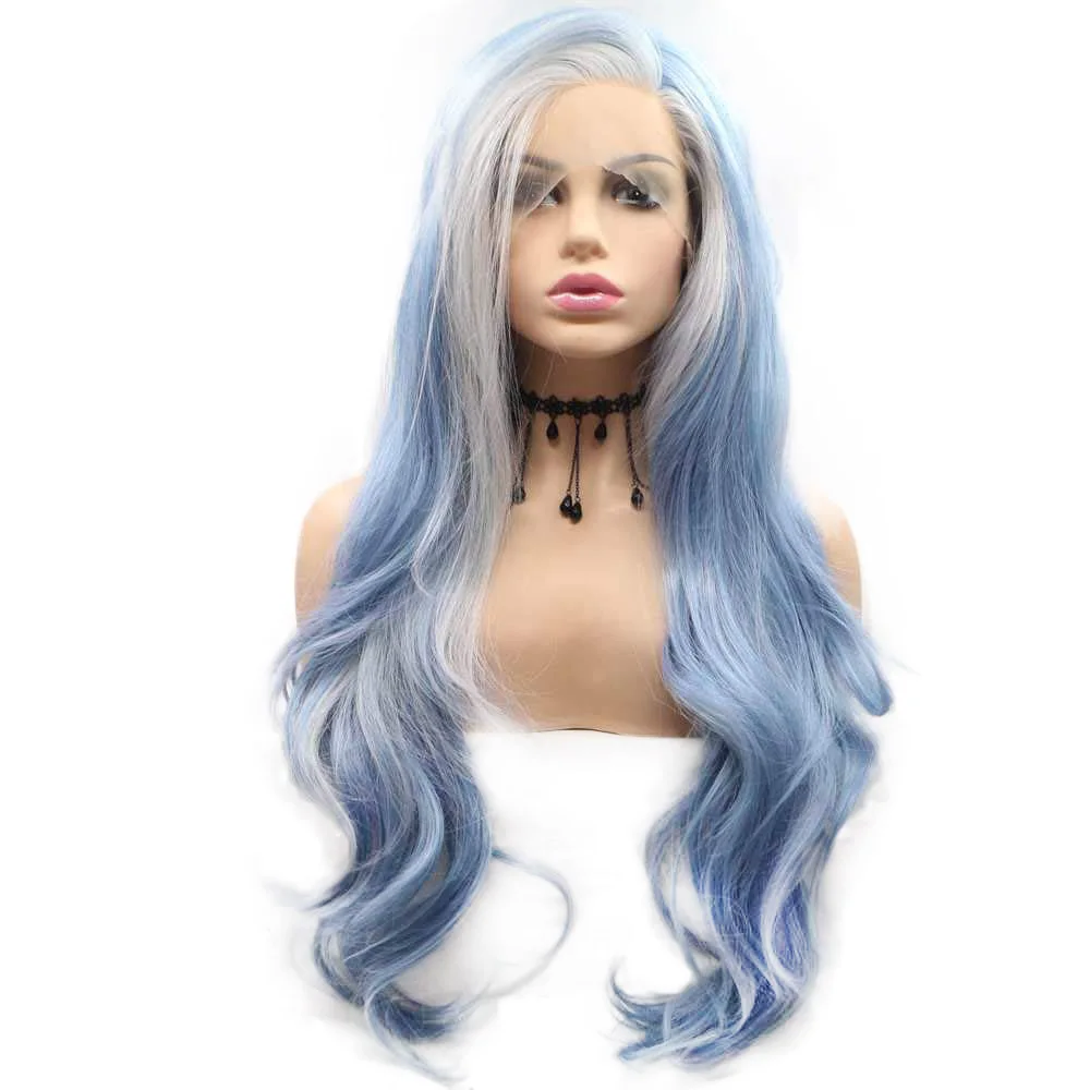 Kanekalon Русалочка синий белый смешанный цвет кружевной передний парик Синтетические длинные натуральные волнистые боковые части парик без клея термостойкие волокна волосы парики для рождественского фестиваля косплей парик