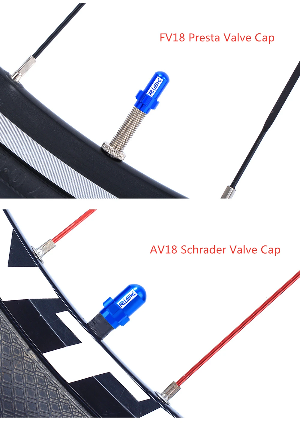 Бренд: RISK Тип: клапан Presta/клапан Schrader Цвет: черный, синий, зеленый, красный Модель: FV18/AV18 Сделано в Китае Вес: однотрубки (0,95 г); Клапан шрадера (1,4 г)