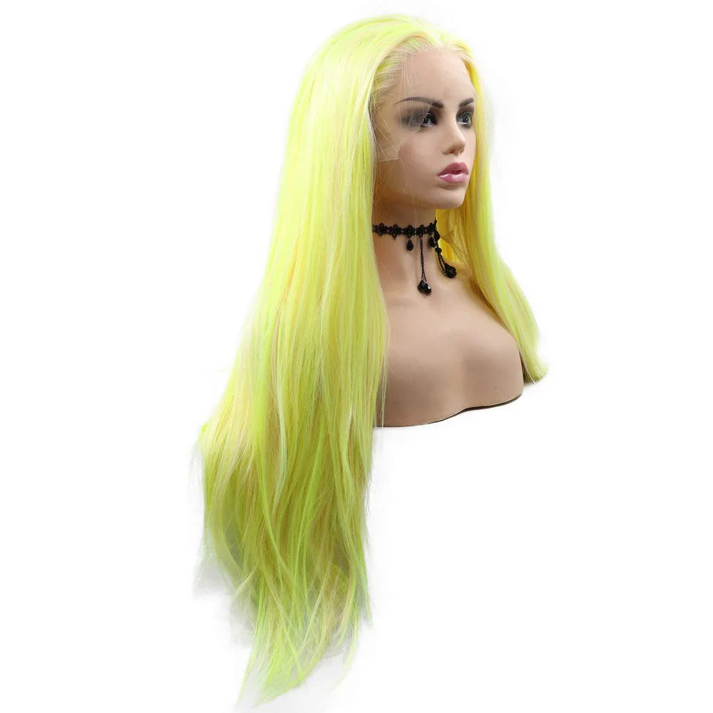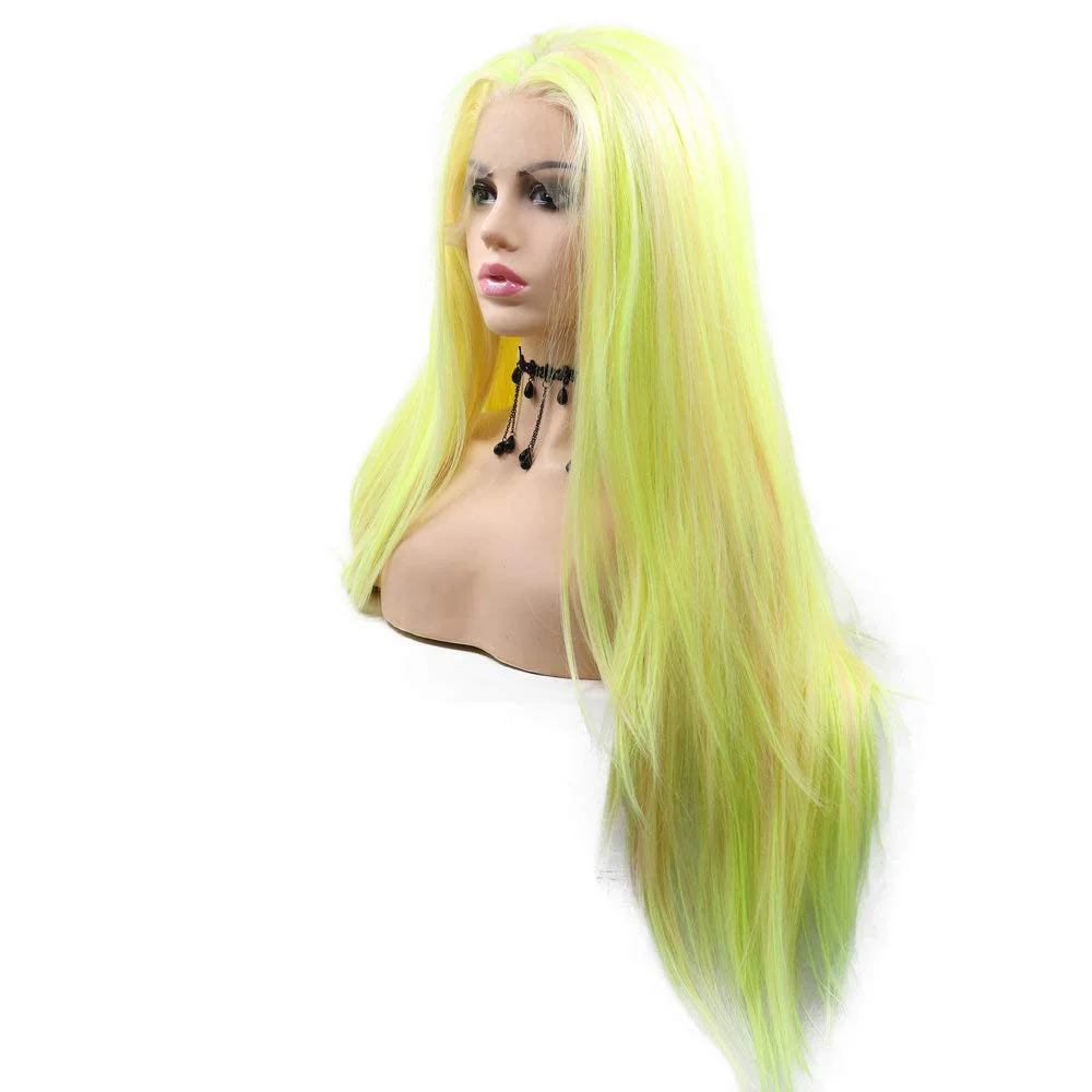 100% мягкое канекалоновое волокно, плотность 150-180% Длинный прямой парик, 24 дюйма (длина может быть настроена), желтый оранжевый хайлайтер (цвет как на фото), безупречная линия волос.