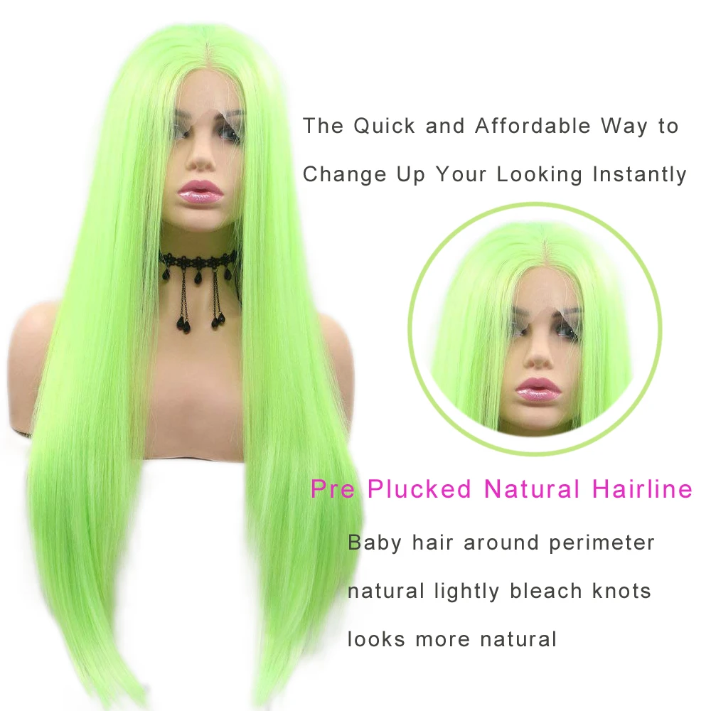 Длинные шелковые прямые парики 24 дюйма, флуоресцентные зеленые парики спереди для женщин, бесклеевая средняя часть, 180% плотность, предварительно отобранные натуральные синтетические парики для волос, термостойкие Сменные парики для косплея, ежедневного использования