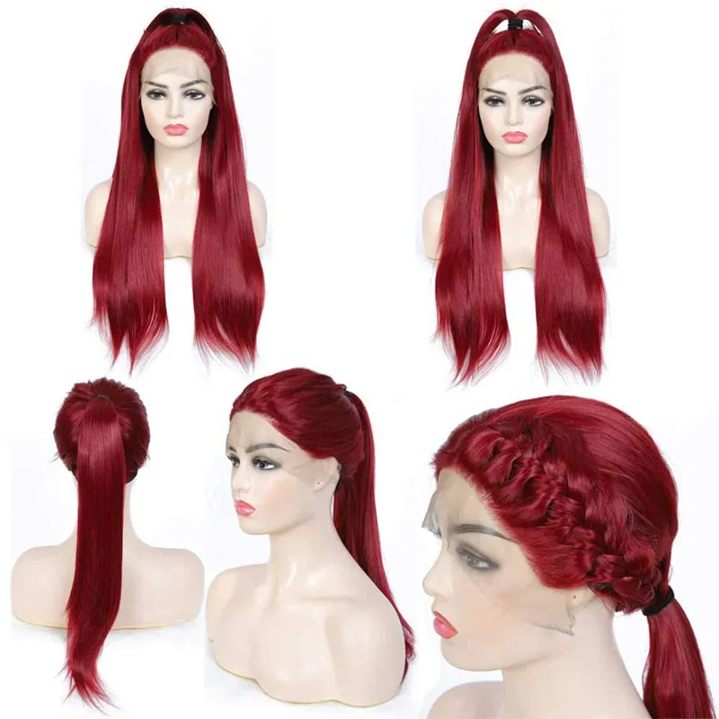 Парики винно-красного цвета для черных женщин, Длинные шелковистые прямые предварительно выщипывающиеся натуральные волосы, кружевные передние парики, термостойкие волокна, парики для волос