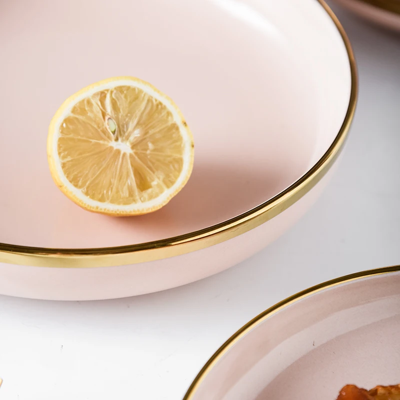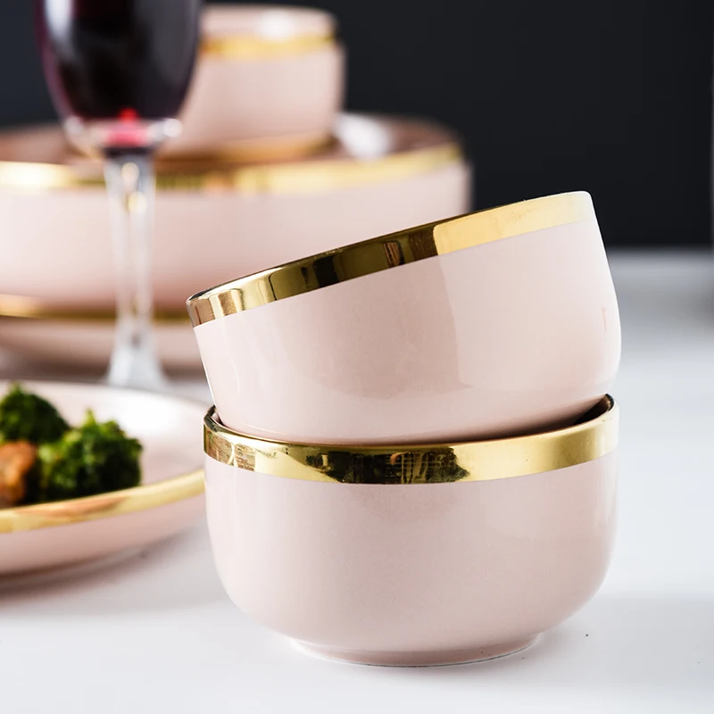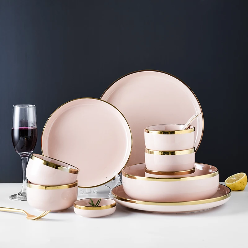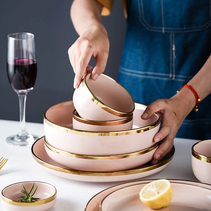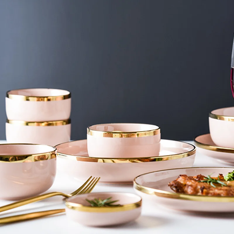 Розовый фарфоровый посуда, обеденные тарелки, блюда, скандинавские золотые инкрустации, керамическая тарелка для еды, тарелки для торта, салатная миска, посуда, набор для ресторана