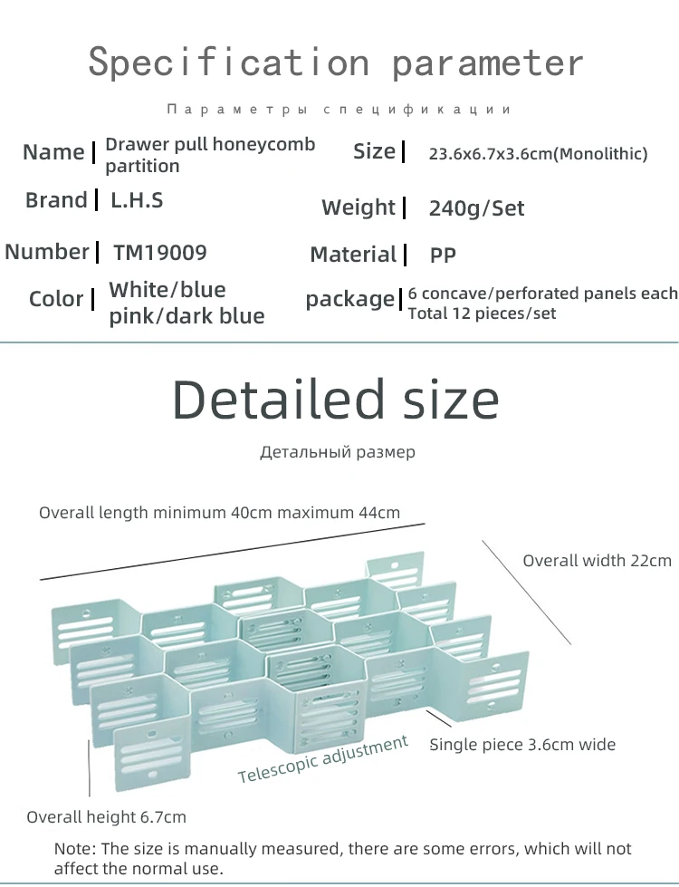 Наименование: сотовая перегородка ящика Размер: 23,6*6,7*3,6 * (цельный) Вес: 240 г/компл. Материал: полипропилен Характеристики: 6 частей вогнутой/дырявой панели, всего 12 шт./компл. Цвет: белый, темно-синий, розовый, светло-голубой Стиль: креативный Место хранения: кухонное хранение, хранение в спальне, хранение в ванной, Хранение Косметики, хранение в гостиной, настольное хранение