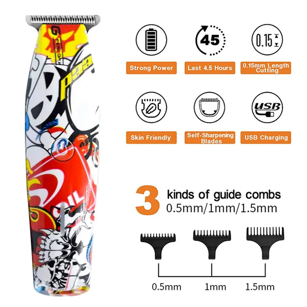 Close cut trimmerUltra-fine steel T-bladePerfect for close cuts, fades, outliningtrimming and haircuts.