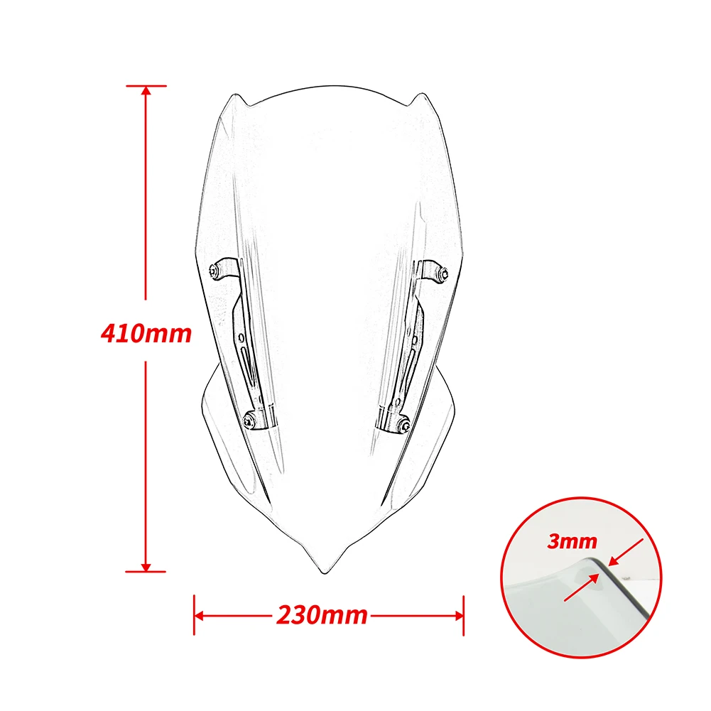 Туристическое ветровое стекло было ветровым туннелем, испытанным для повышения защиты от ветра и комфорта на скоростях шоссе. Он изготовлен из 3 мм толстого ударопрочного акрила, чтобы противостоять вибрации, царапинам и растрескиванию.