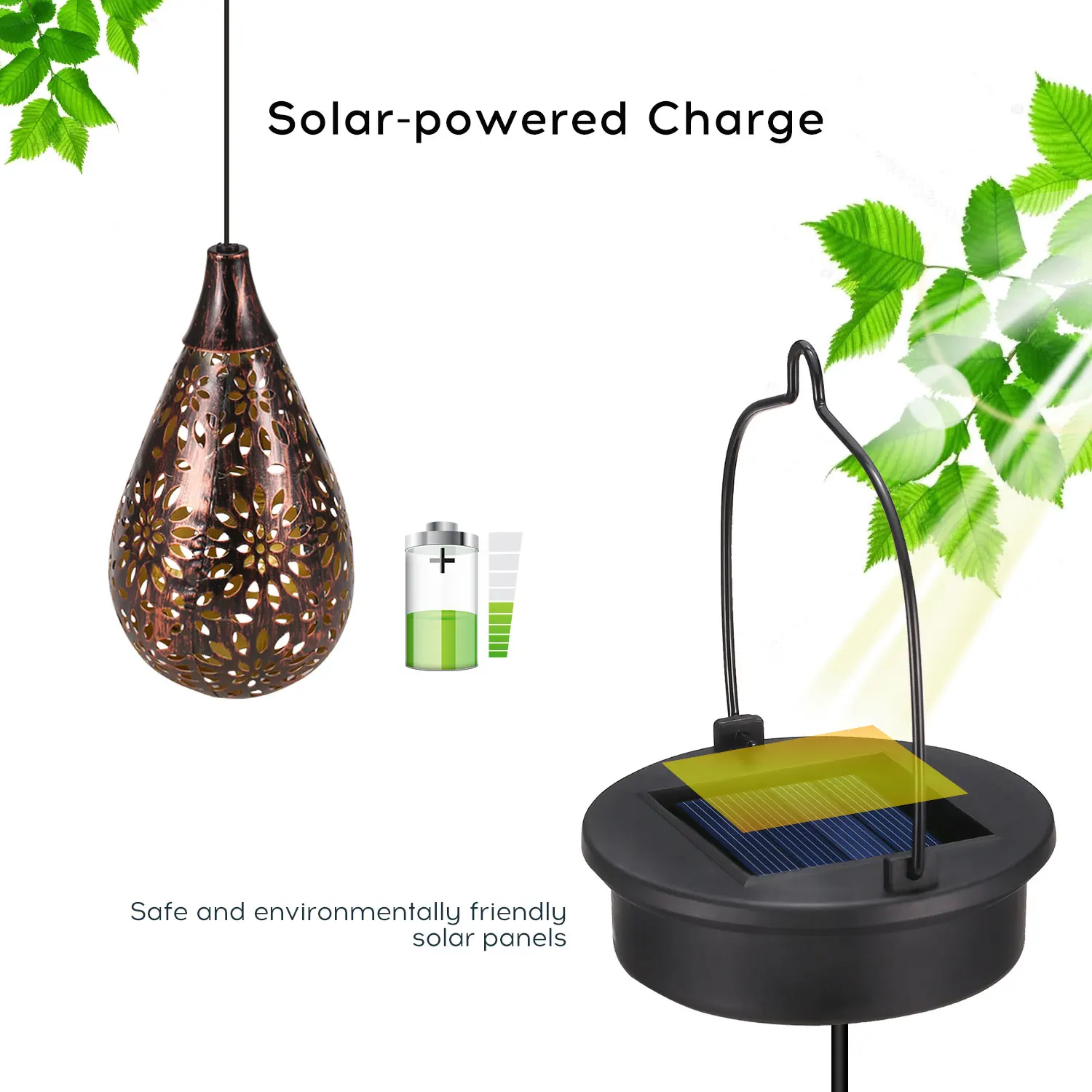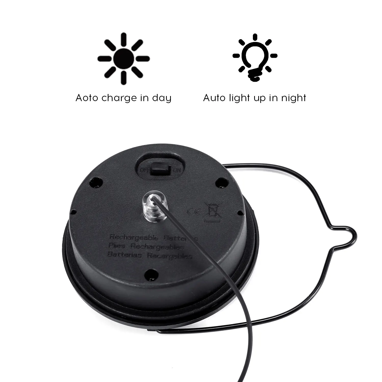 На солнечной энергии, без проводов, просто поместите его под Солнечный свет, чтобы поглощать солнечную энергию в день, тогда солнечная панель перенесет солнечную энергию в светильник, электричество в темноте.