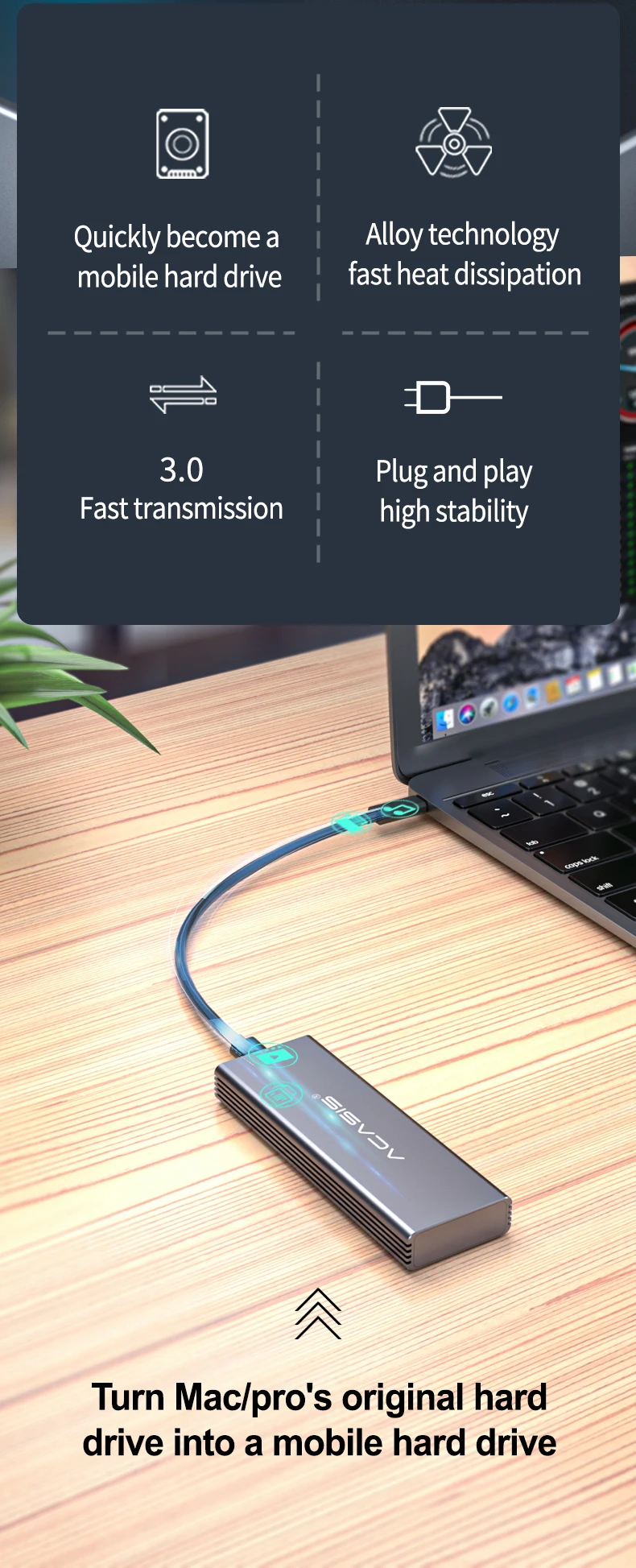 Внешний чехол ACASIS NVME M.2 SSD Эксклюзивный чехол для жесткого диска ACASIS Type-C USB3.0 Type-C Macbook Air/Pro превращает оригинальный жесткий диск Mac в съемный диск. Поддерживает Windows, Mac dual system, сильную совместимость, не нужно водить. Передача 5 Гбит/с Отправка к тип-c USB3.0 5GPs, измерение непрерывного чтения и записи, чтение до 452 МБ/с., высокая скорость отправки Примечание: система, которая в настоящее время поддерживает UASP, должна быть WIN8/WIN10/MAC 0S8 и 9 или выше, и ПК должен поддерживать функцию UASP. ПК, ОС, жесткий диск, передача отличается. Производительность может отличаться. Вышеуказанные данные получены от ACASIS. О совместимости Этот продукт доступен только для MacBook Apple 2014 2016 2017 Air, Pro и т. Д. И таких серий, как MacBook Air/Pro 2014 2015 2016 2017 имеют встроенный SSD. Обратите внимание: твердотельные накопители Toshiba и OWC не поддерживаются, пожалуйста, убедитесь, что ваш SSD MacBook совместим с этим интерфейсом. Прочный и стабильный Высококачественный алюминиевый сплав, он прочный, устойчивый к давлению и имеет Превосходное тепловыделение. Предотвращает аномальное образование тепла продукта. Удобство Внутренний Размер 108*32*13 мм, внешний Размер 108*38*13 мм размер удобно носить с собой. Не требуется привод, горячая замена, готов к подключению и использованию. Способ установки: 1. Удалите печатную плату, вставьте жесткий диск в слот и зафиксируйте жесткий диск. 2. Вставьте печатную плату установленного жесткого диска к жесткому диску. 3. Вставьте переднюю крышку в чехол и затяните винты.