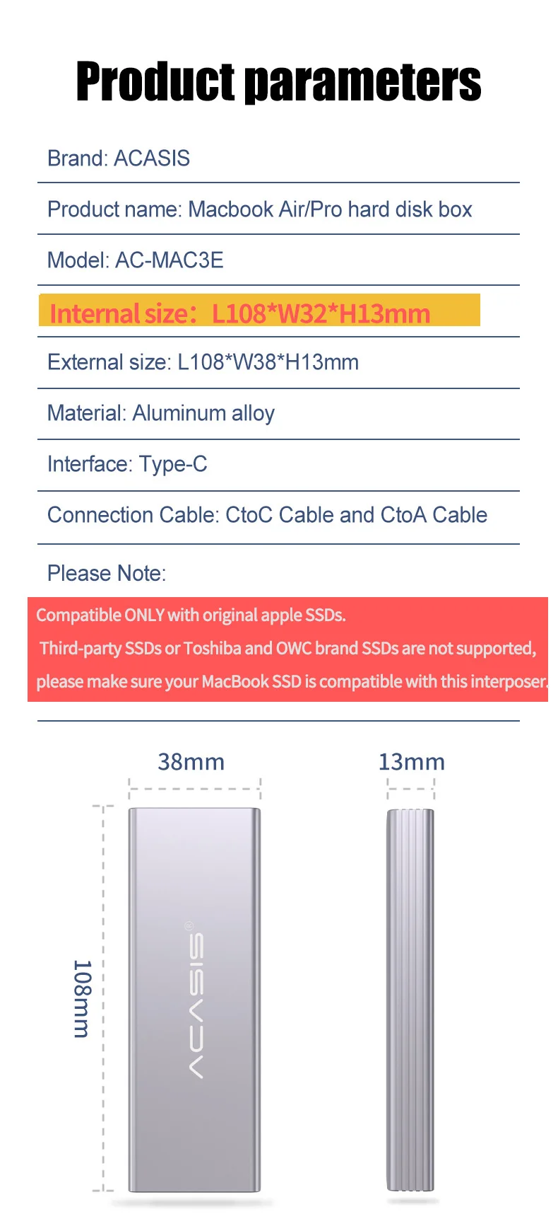 Обратите внимание: Совместимость только с оригинальными SSDs apple. Сторонние твердотельные накопители или твердотельные накопители марки Toshiba и OWC не поддерживаются, пожалуйста, убедитесь, что ваш SSD MacBook совместим с этим интерфейсом.