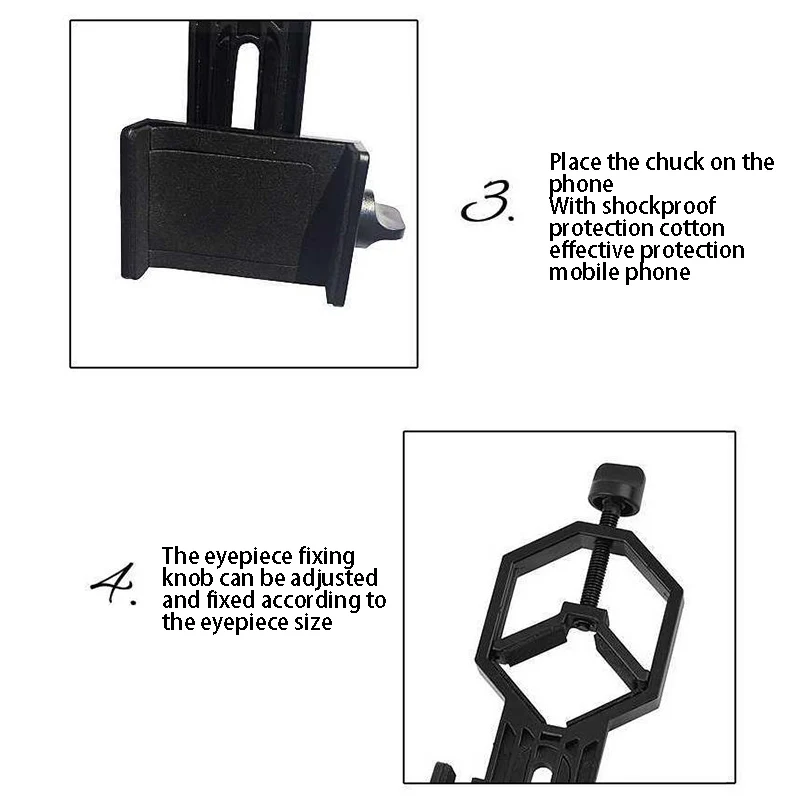 Зажим для телефона телескопа изготовлен из высококачественного алюминиевого сплава в качестве корпуса и АБС-пластика в качестве держателя телефона, который является легким и прочным. Он используется для длительного времени.