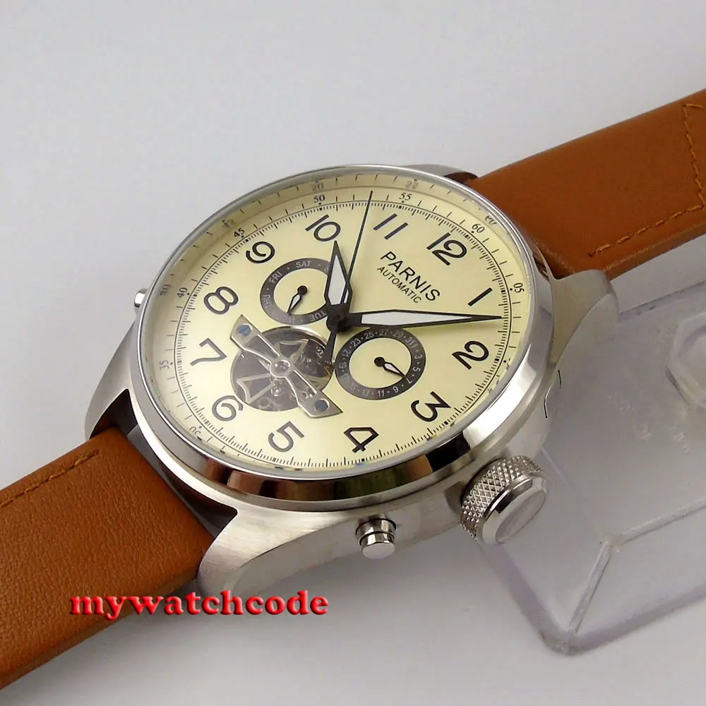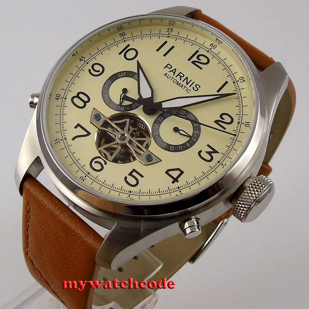 Механизм: автоматическое движение/движение с автозаводом Циферблат: Есть два циферблата, которые вы можете выбрать 1. Черный циферблат 2. Часы с белым циферблатом Материал корпуса: твердый корпус из нержавеющей стали 316L Чехол Размер: Диаметр: 43 мм Ремешок: 22 мм ширина кожаный ремешок Тип застежки: Застежка-булавка Стекло: специальное устойчивое к царапинам минеральное стекло Многофункциональный индикатор