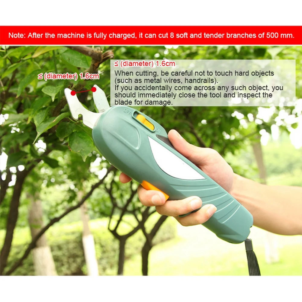 2. Беспроводной обрезной станок использует прочные стальные лезвия с максимальным диаметром резки 16 мм, которые могут быть легко обрезаны, и использование обрезки различных растений (таких как розы, цветы, ягоды, кустарники и вечнозеленые) простые и быстрые.