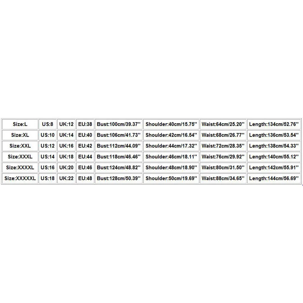Размер США Великобритания ЕС Бюст Плечо Талия Длина L 8 12 38 100 см/39,37'' 40 см/15,75'' 64 см/25,20'' 134 см/52,76'' XL 10 14 40 106 см/41,73'' 42 см/16,54'' 68 см/26,77'' 136 см/53,54'' XXL 12 16 42 112 см/44,09'' 44 см/17,32'' 72 см/28,35'' 138 см/54,33'' XХХL 14 18 44 118 см/46,46'' 46 см/18,11'' 76 см/29,92'' 140 см/55,12'' XXXXL 16 20 46 124 см/48,82'' 48 см/18,90'' 80 см/31,50'' 142 см/55,91'' XXXXXL 18 22 48 128 см/50,39'' 50 см/19,69'' 88 см/34,65'' 144 см/56,69''