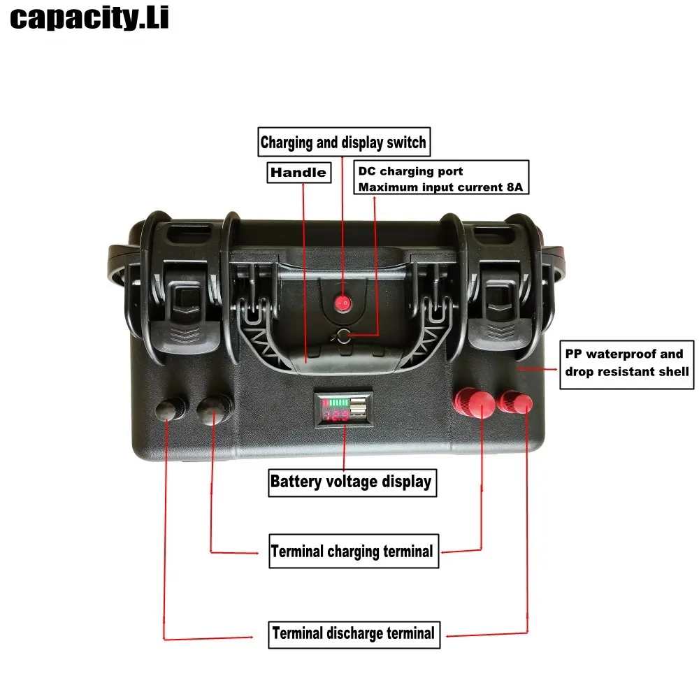 Емкость. Li Технические параметры Номинальное напряжение 12 В Номинальная мощность: 100 Ач 1. Материал батареи: литиевый Аккумулятор LiFePO4 2. Размер: 360*330*148 мм (длина, ширина и высота) 3. Вес: около 11 кг 4. Диапазон рабочего напряжения: 10 В ~ 14,6 в 5 Номинальное напряжение 12,8 В 6. Мгновенный ток разряда: ≤ 200A 7. Непрерывный ток разряда: ≤ 100A 8. Срок службы: более 3000 циклов 9. Рабочая среда: 0 ~ 45 ℃ (загрузка), -20 ~ 60 ℃ (загрузка). 10. Зарядное устройство ① Напряжение зарядки: 14,6 в ② Ток зарядки: 10 a ③ Время зарядки: около 12 часов Гарантия на батарею: 12 месяцев (части и техническая поддержка предоставляются бесплатно, и покупатель должен оплатить перевозку соответствующим образом) Преимущества продукта: Легкий в переноске, светильник с большим весом, большой вместимостью, высокой платформой, долгим рабочим временем, долгим сроком службы, безопасностью и защитой окружающей среды
