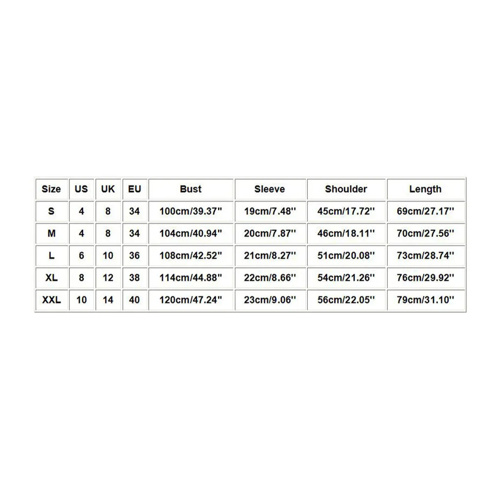 Размер США Великобритания ЕС Бюст Рукав Плечо Длина S 4 8 34 100 см/39,37'' 19 см/7,48'' 45 см/17,72'' 69 см/27,17'' М 4 8 34 104 см/40,94'' 20 см/7,87'' 46 см/18,11'' 70 см/27,56'' L 6 10 36 108 см/42,52'' 21 см/8,27'' 51 см/20,08'' 73 см/28,74'' XL 8 12 38 114 см/44,88'' 22 см/8,66'' 54 см/21,26'' 76 см/29,92'' XXL 10 14 40 120 см/47,24'' 23 см/9,06'' 56 см/22,05'' 79 см/31,10''