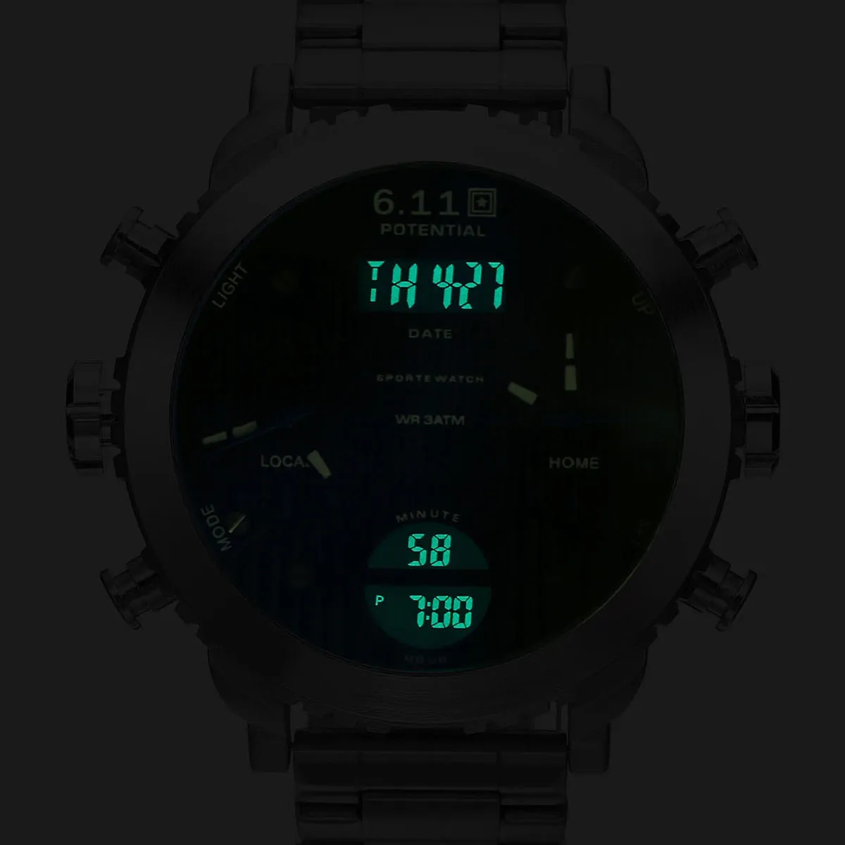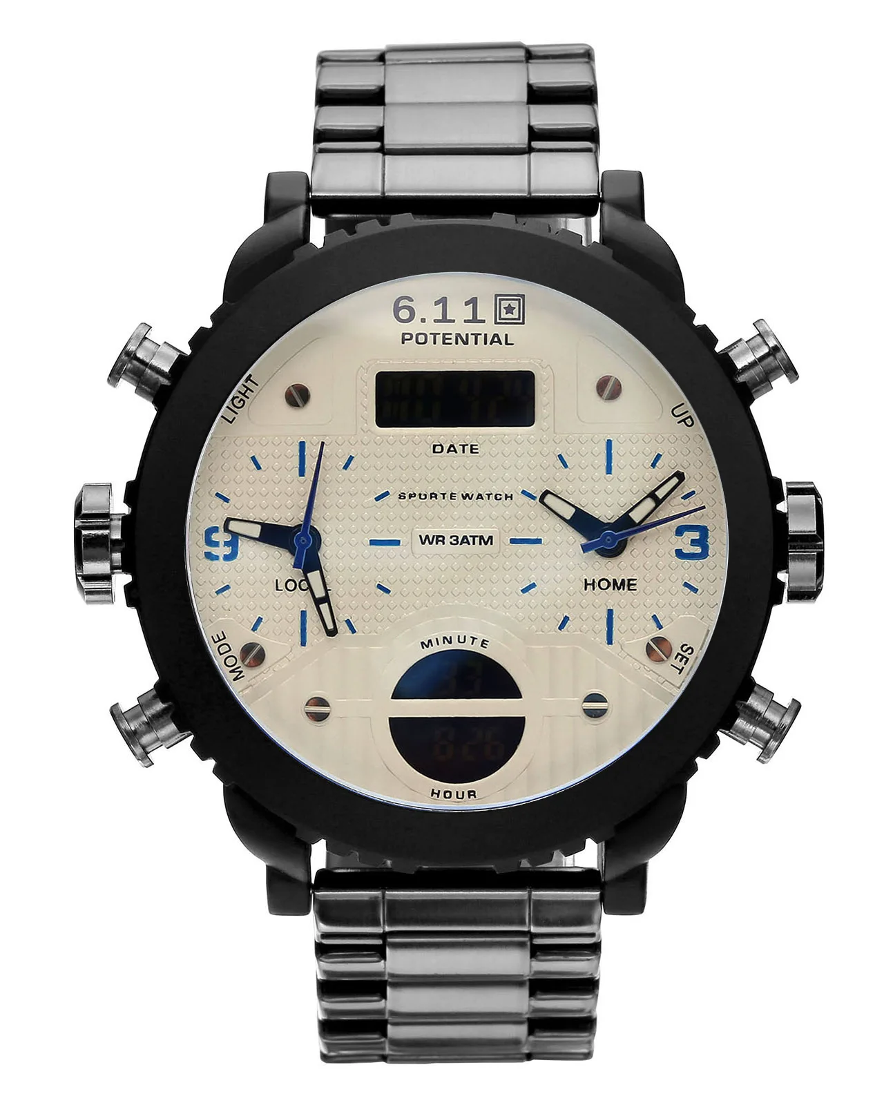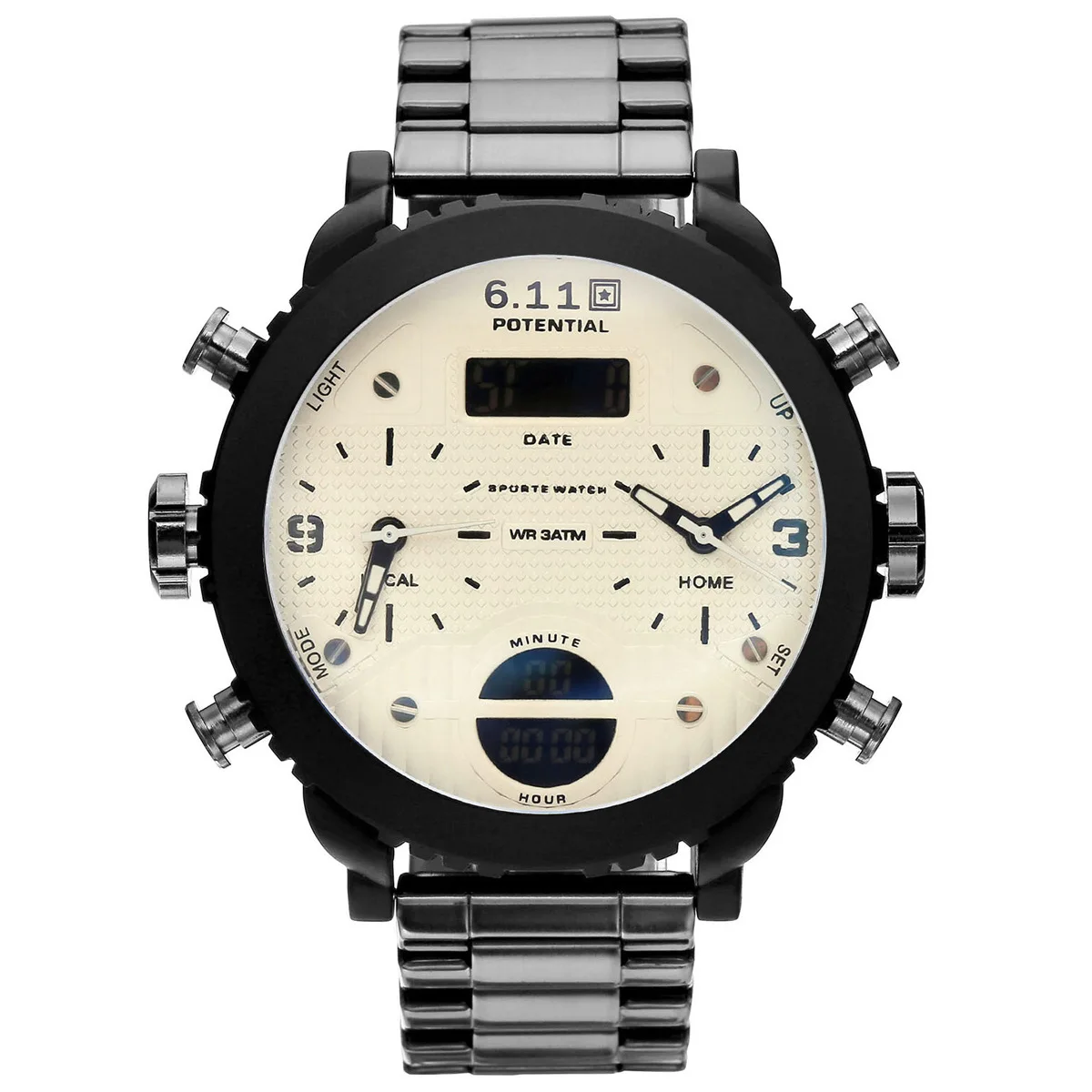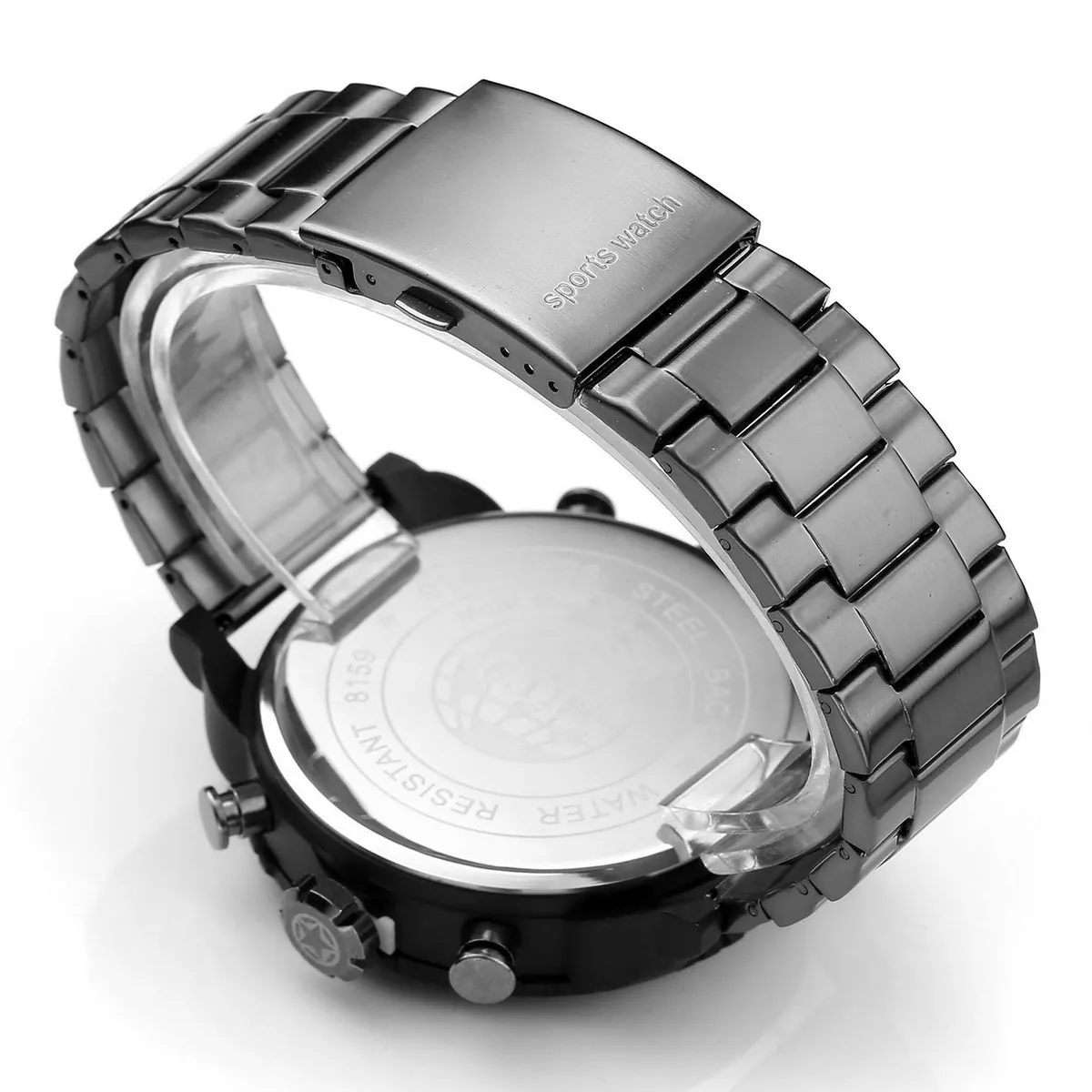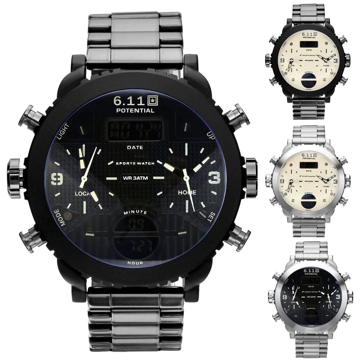 Мужские часы с двойным дисплеем, многофункциональные электронные часы, светящийся счетчик даты, второй задний светильник, указатель, спортивные часы со стальным ремешком