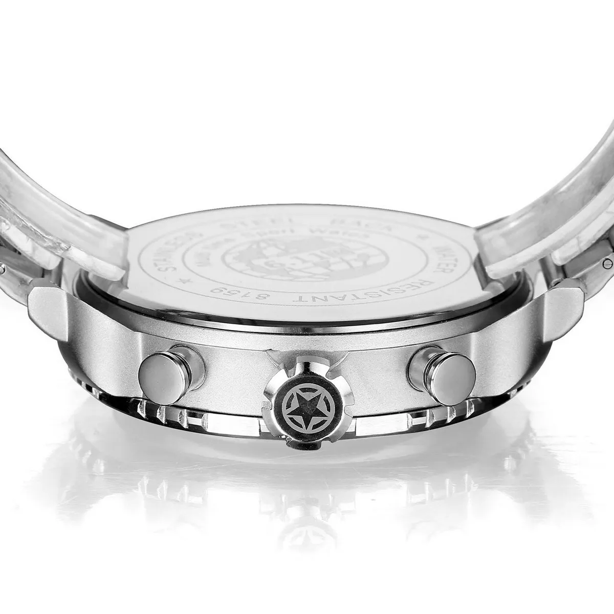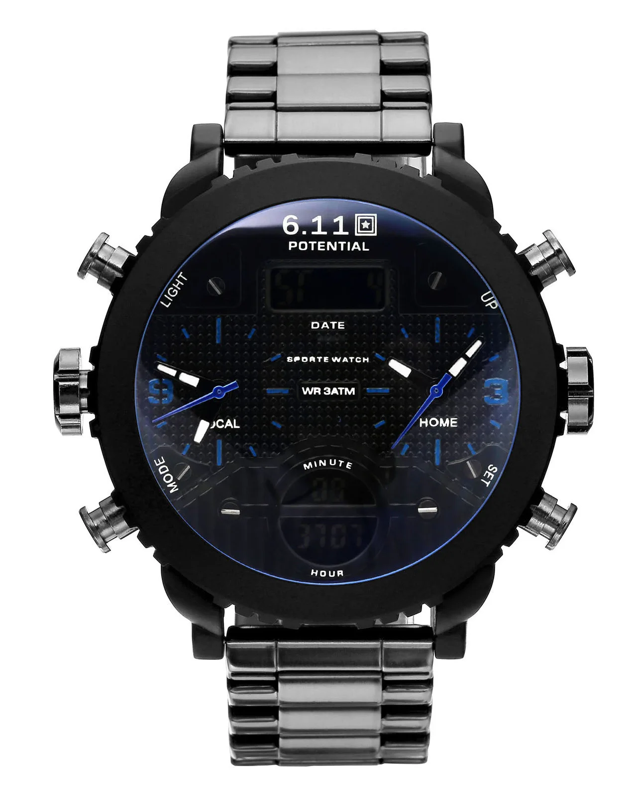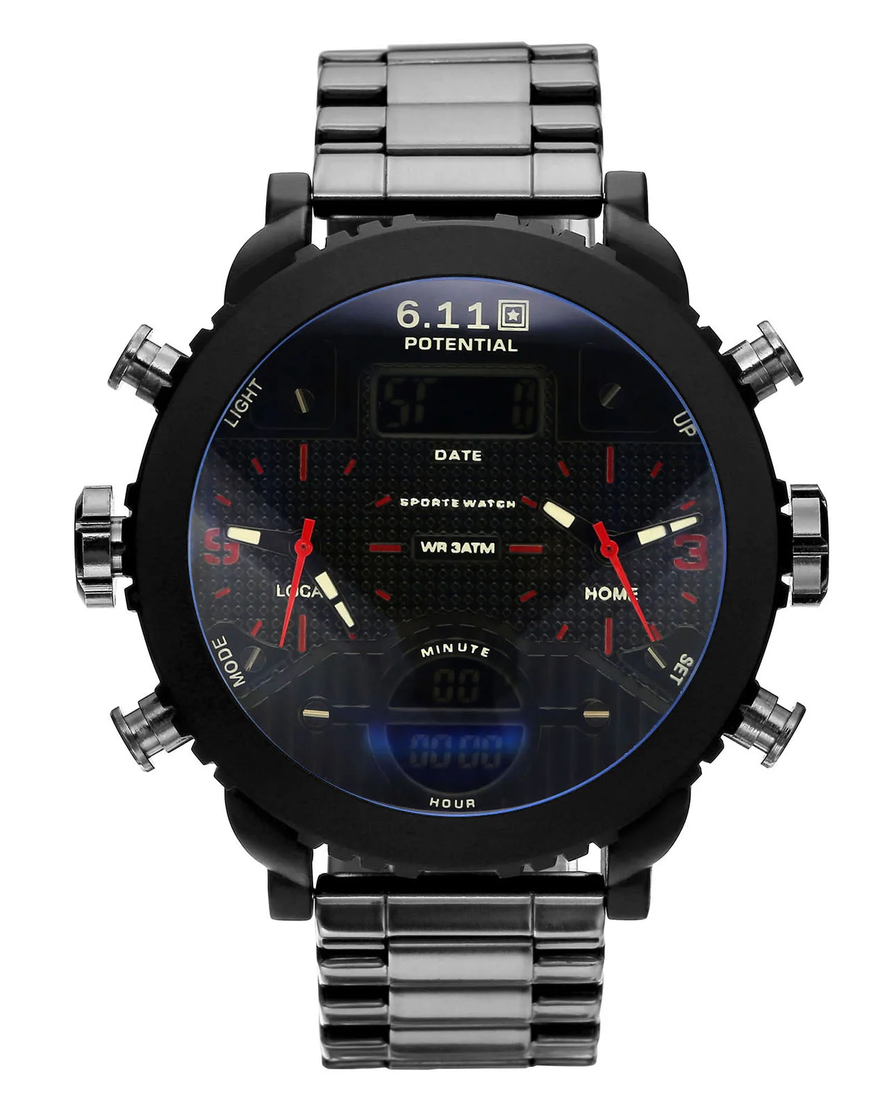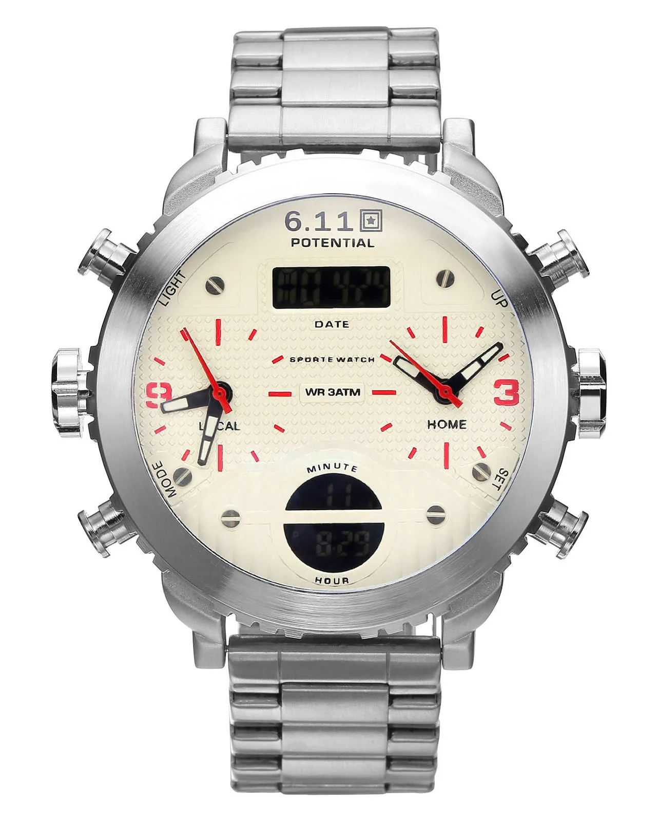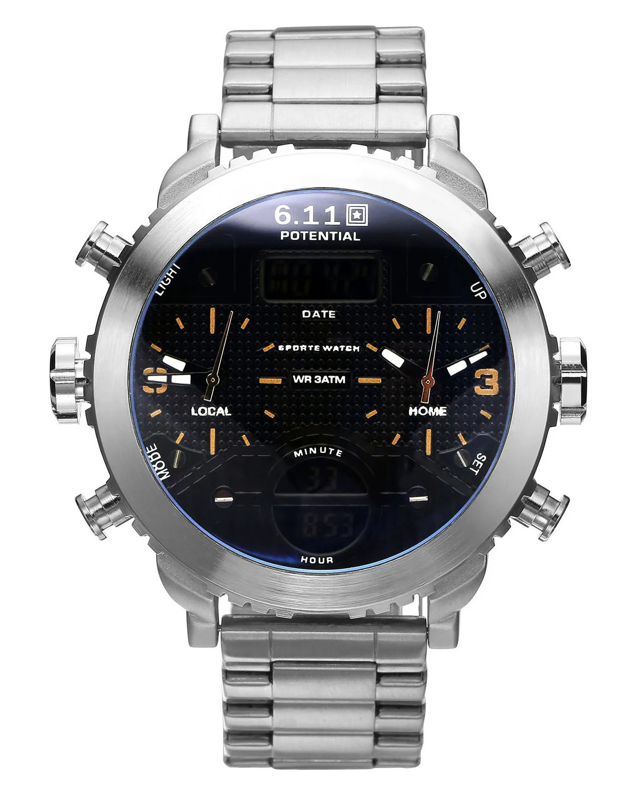 Мужские часы с двойным дисплеем, многофункциональные электронные часы, светящийся счетчик даты, второй задний светильник, указатель, спортивные часы со стальным ремешком