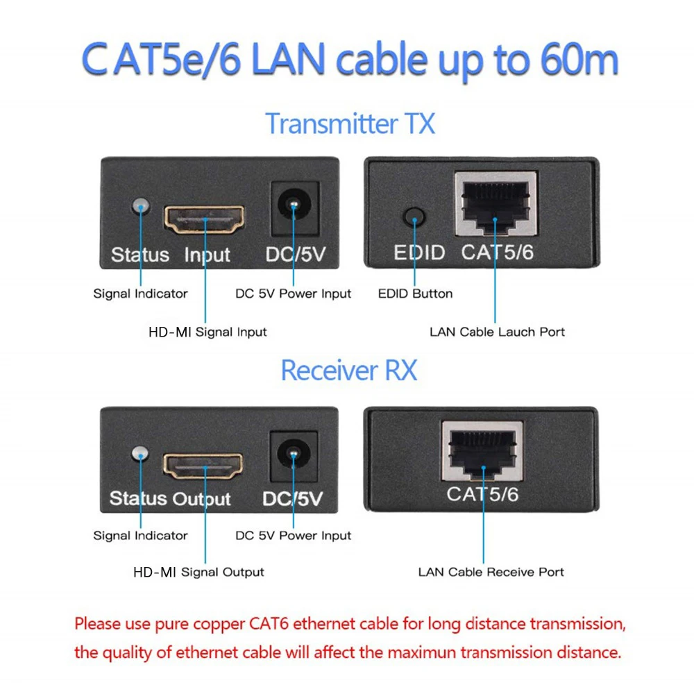 1. Чтобы улучшить качество передачи изображения, выберите Кабель CAT-6. 2. Низкокачественный Интернет-кабель не может достичь наилучшего эффекта передачи видео и расстояния передачи. 3. Если расстояние передачи продукта не может достигать 50 метров, сначала проверьте качество кабеля.