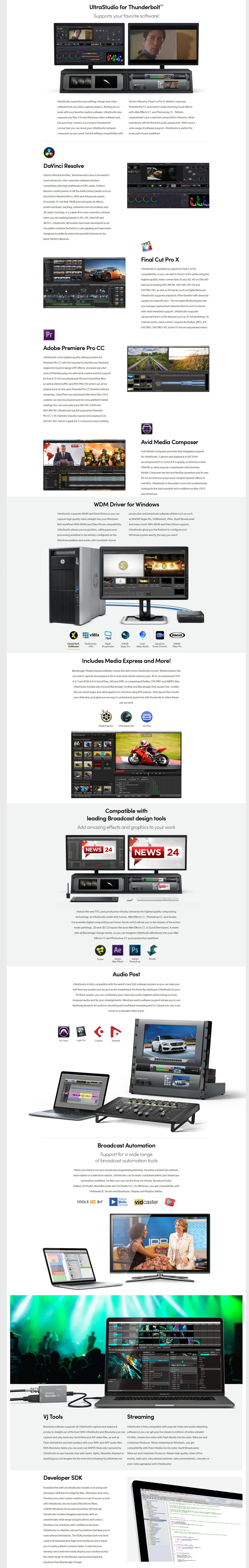 UltraStudio HD Mini имеет профессиональные соединения качества трансляции, которые включают 3G-SDI, аналоговый YUV и композитный NTSC/PAL видео входы, а также справочный вход. Есть также два "аудио соединения для аналогового аудио входа, которые работают с сбалансированными и HiFi источниками. Кроме того, UltraStudio HD Mini может дистанционно управлять профессиональными блоками вещания с помощью встроенного RS-422 подключения. Для выхода вы получаете двойную ссылку 3G-SDI с заполнением и ключом, а также HDMI соединение для мониторинга видео с большим экраном телевизора!