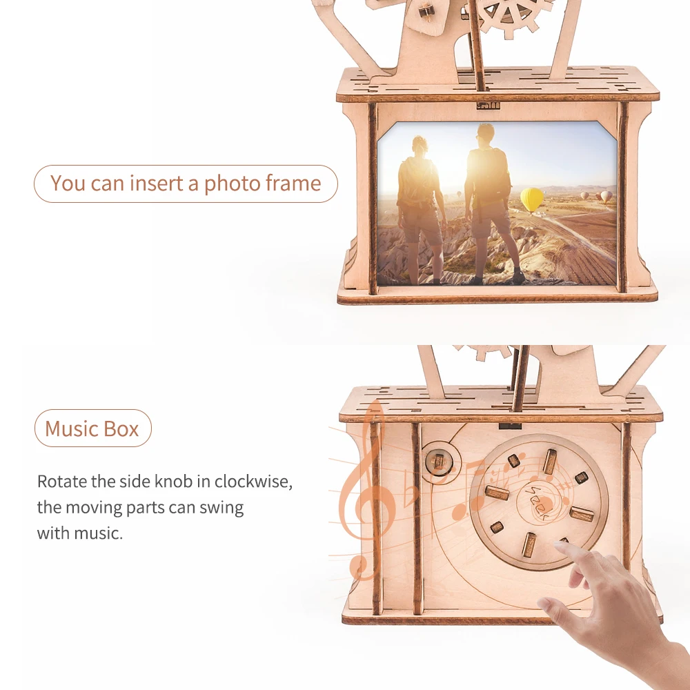 130 деталей для сборки. Вы можете вставить фото рамка, около 8,2*6,5 см. Это также музыкальная шкатулка, вы можете вращать боковую ручку по часовой стрелке, подвижные части могут качаться музыкой.
