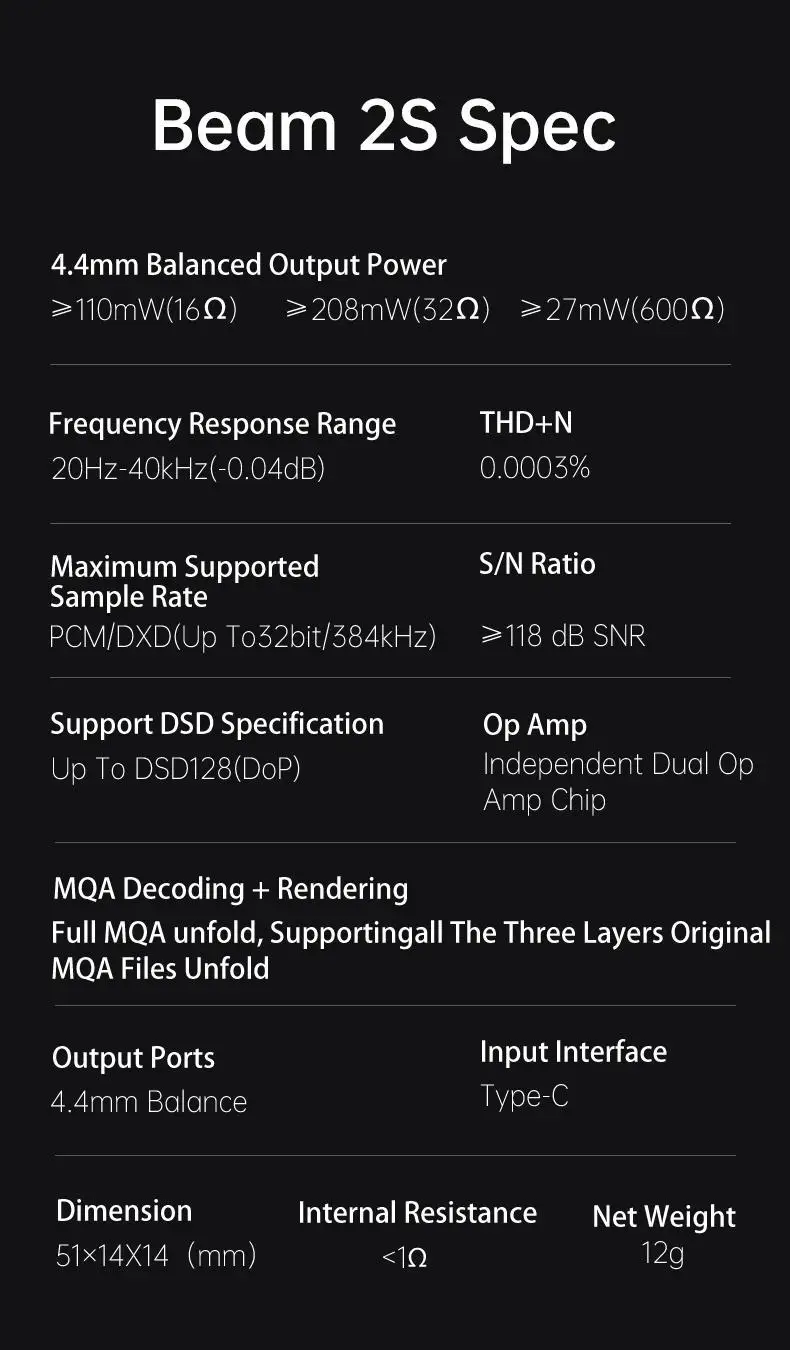 Beam2s Параметры продукта: Выход: 4,4 мм сбалансированный Выход мощность ≥ 110 МВт (16 Ом)/ ≥ 208 МВт (32 Ом)/ ≥ 27 МВт (600 Ом) Частотная характеристика: 20z-40kHz (-0.04dB) Искажение + шум (THD + N): 0.0003% Максимальная поддерживаемая Частота дискретизации: PCM / XD (до 32 бит/384 кГц) Отношение сигнал-шум: ≥ 118 дБ SNR Поддержка DSD Спецификация: до DSD128 (DoP) Op Amp: ESS ESS92181C PRO Независимый двойной Op amp Чип MQA декодирование + рендеринг: полный MQA декодер, расширение третьего слоя рендеринга MQA файлов Выход порт: 4,4 мм (балансный) Входной интерфейс: Type-C Корпус: 51 × 14x14 мм Внутреннее сопротивление: <1Ω Вес нетто: 12 г Посылка: * Луча 2s * TYPE-C кабель * Освещение соединительная линия * USBA порт адаптер