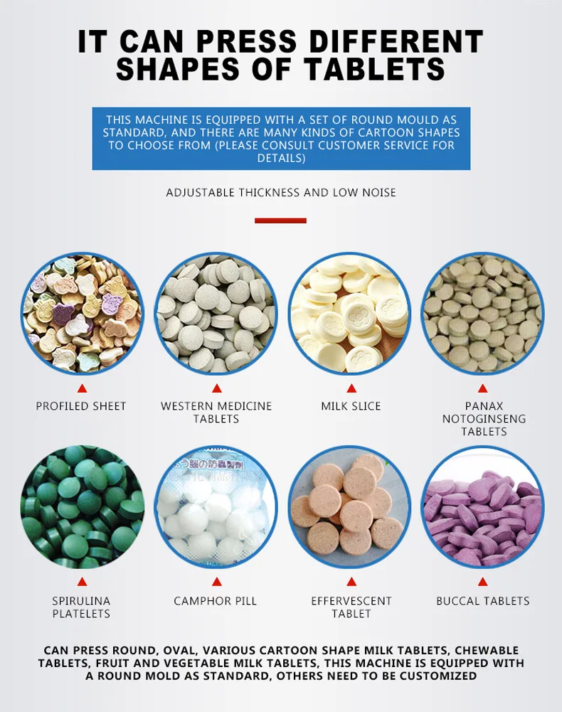 1. С 5T регулируемым давлением и корпус машины изготовлен из высококачественной стали, вес нетто составляет 75 кг, что делает машину стабильной во время работы 2. С мощностью 750 Вт Обновленный двигатель защитит машину от горения и не шумит во время работы 3. Использование накатанного винта для регулировки давления, что делает работу легкой и экономичной 4. Наклонная розетка позволяет таблеткам легко выходить. И она изготовлена из нержавеющей стали, которая может защитить планшет от повреждения 5. С функцией инширования, что делает машину легкой для тестирования и регулировки 6. Хоппер больше, и это удобно, когда вы заливаете материал. Это поможет вам сделать таблетки лучше и равномерно. Применение Одна штамповочная машина, давление 5 тонн, может надавить гранулированный материал на таблетки. Он может нажимать различные формы таблеток. Вес, толщина и твердость продукта можно отрегулировать. Если вы хотите нажать на различные продукты, вам просто нужно заменить различные формы. Он может быть широко использован в: фармацевтической промышленности, химической промышленности, промышленности здравоохранения, научно-исследовательских единиц, лабораторий, больниц, пищевой промышленности