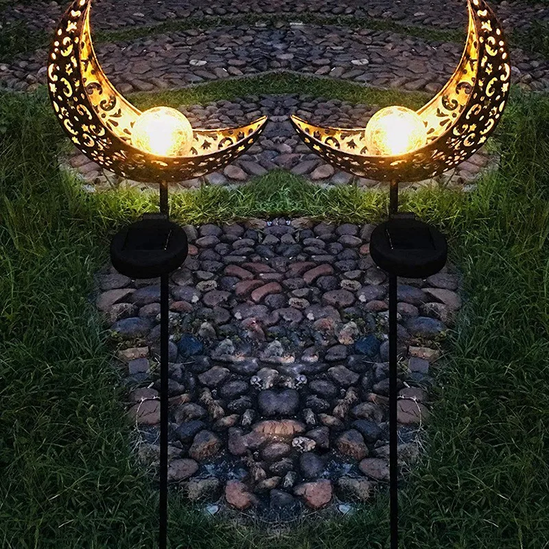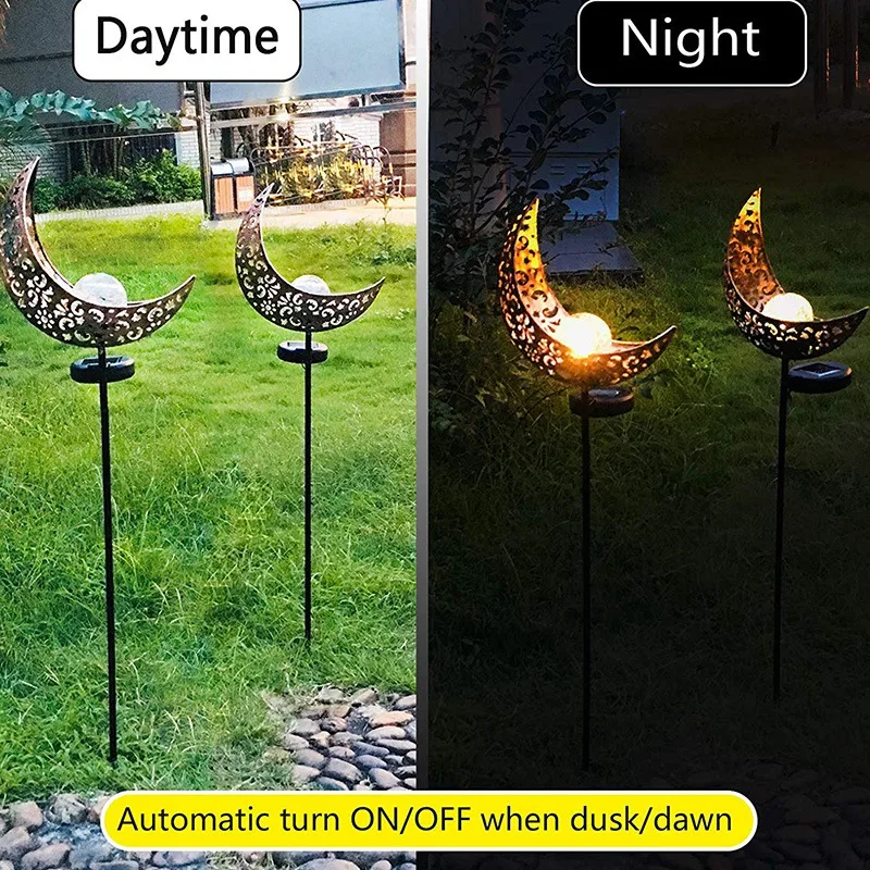 IP55 водонепроницаемый наружный садовый декор, высококачественный Железный нержавеющий и винтажный медный цвет, полый лунный стиль, теплое белое светодиодное освещение с хрустальным стеклянным глобусом обеспечивают вам сказочную луну. Украсьте и добавьте восхитительное ландшафтное освещение в лужайку, патио, сад, двор или цветники.