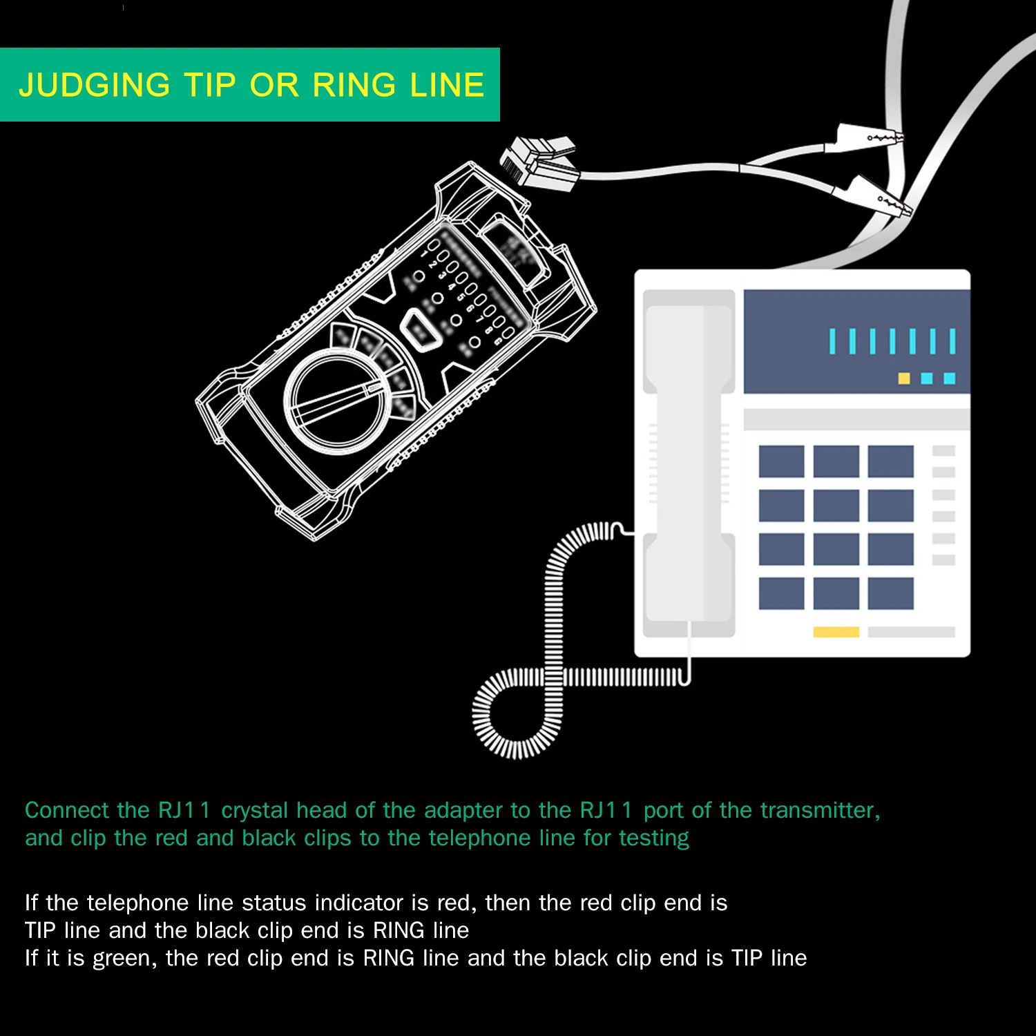 Обнаружение состояния телефонной линии: Используйте передатчик для проверки состояния рабочей телефонной линии (холостого хода, звонка, выключения) и дискриминирующего наконечника или кольцевой линии.