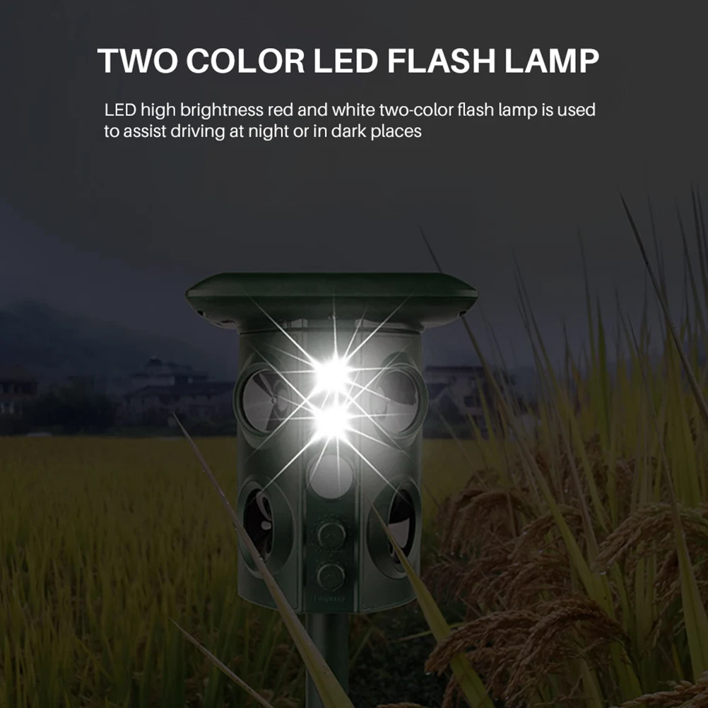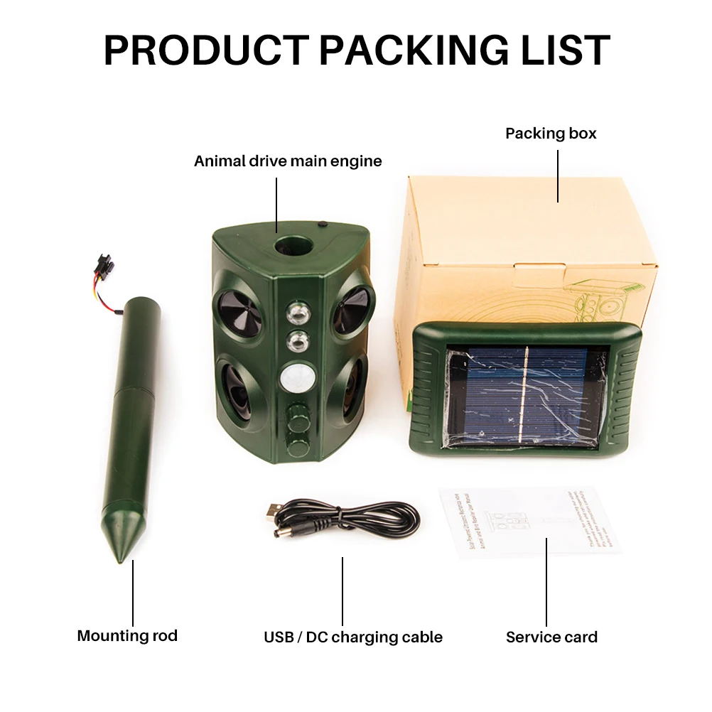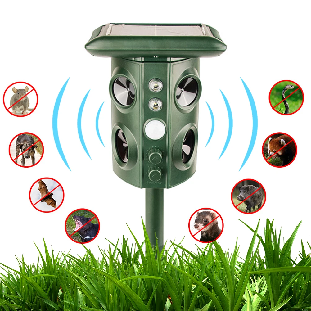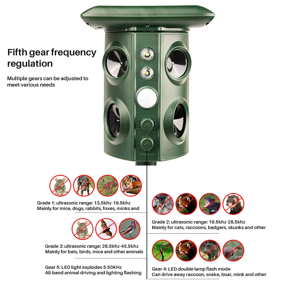 1. Сильный светодиодный фонарик и сильный ультразвуковой приводной животных. Когда животное входит в область, срабатывает инфракрасный датчик, и продукт излучает сильный светодиодный фонарик и ультразвуковой, чтобы животное покинуло область. Очень эффективно удаляет собак, кошек, мышей, Лис, енотов, барсуков, скунков, грызунов, диких кабанов, Мартина и т. д.