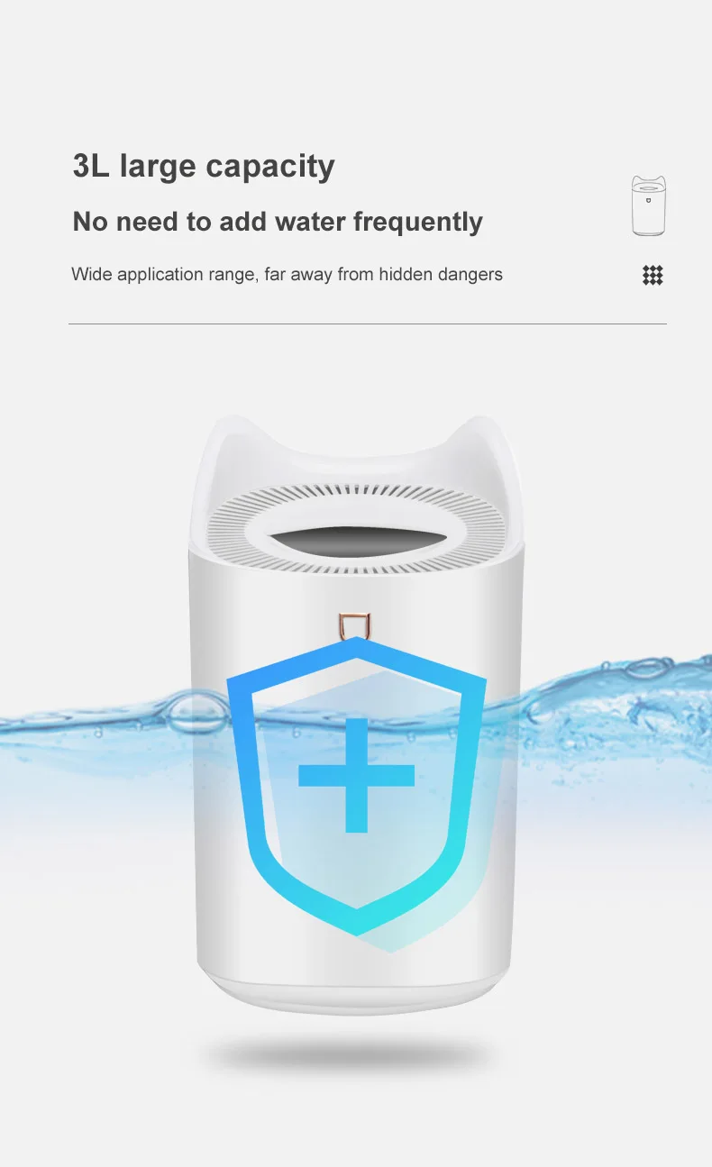 3L большой резервуар. Он имеет большой бак большой емкости 3л для обеспечения длительного времени работы. Он может прослужить весь день без заправки водой.