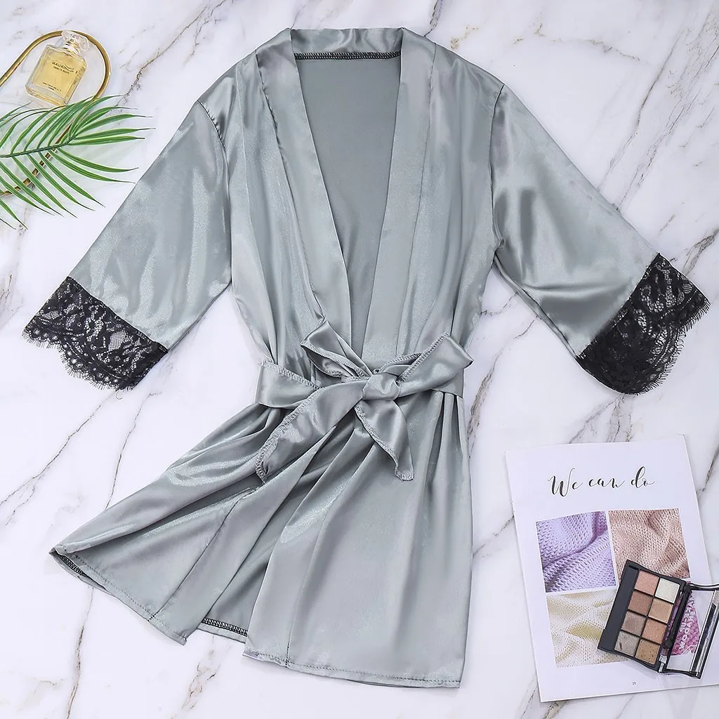 Женские пижамы, комплект из 3 предметов, атласный шелковый халат, кружевные подтяжки, шелковые шорты, удобные, приятные для кожи сексуальные пижамы F04