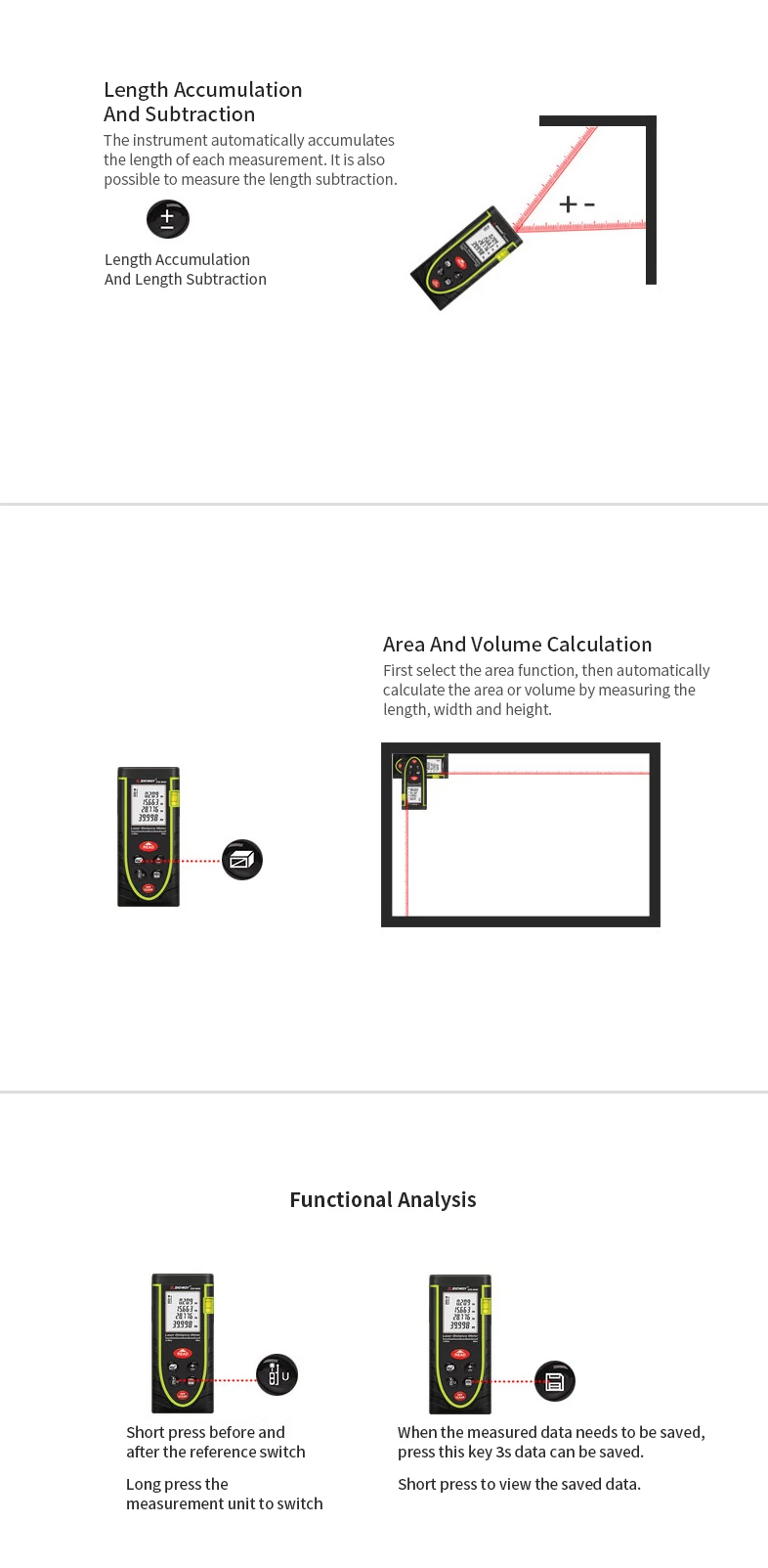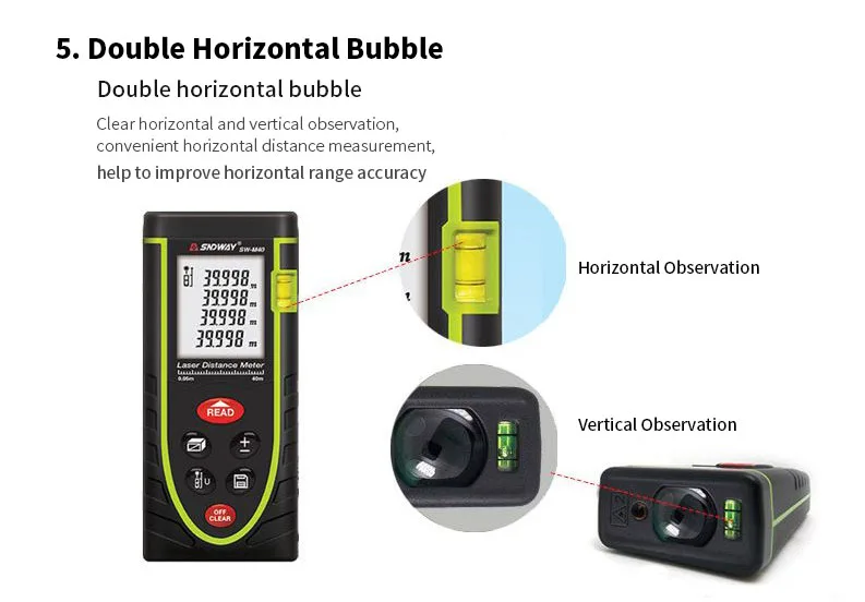 -Двойной горизонтальный с пузырем: Двойной горизонтальный с пузырем, четкое горизонтальное и вертикальное наблюдение, удобное измерение горизонтального расстояния, помогает улучшить точность горизонтального диапазона.