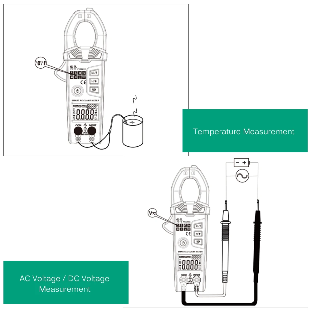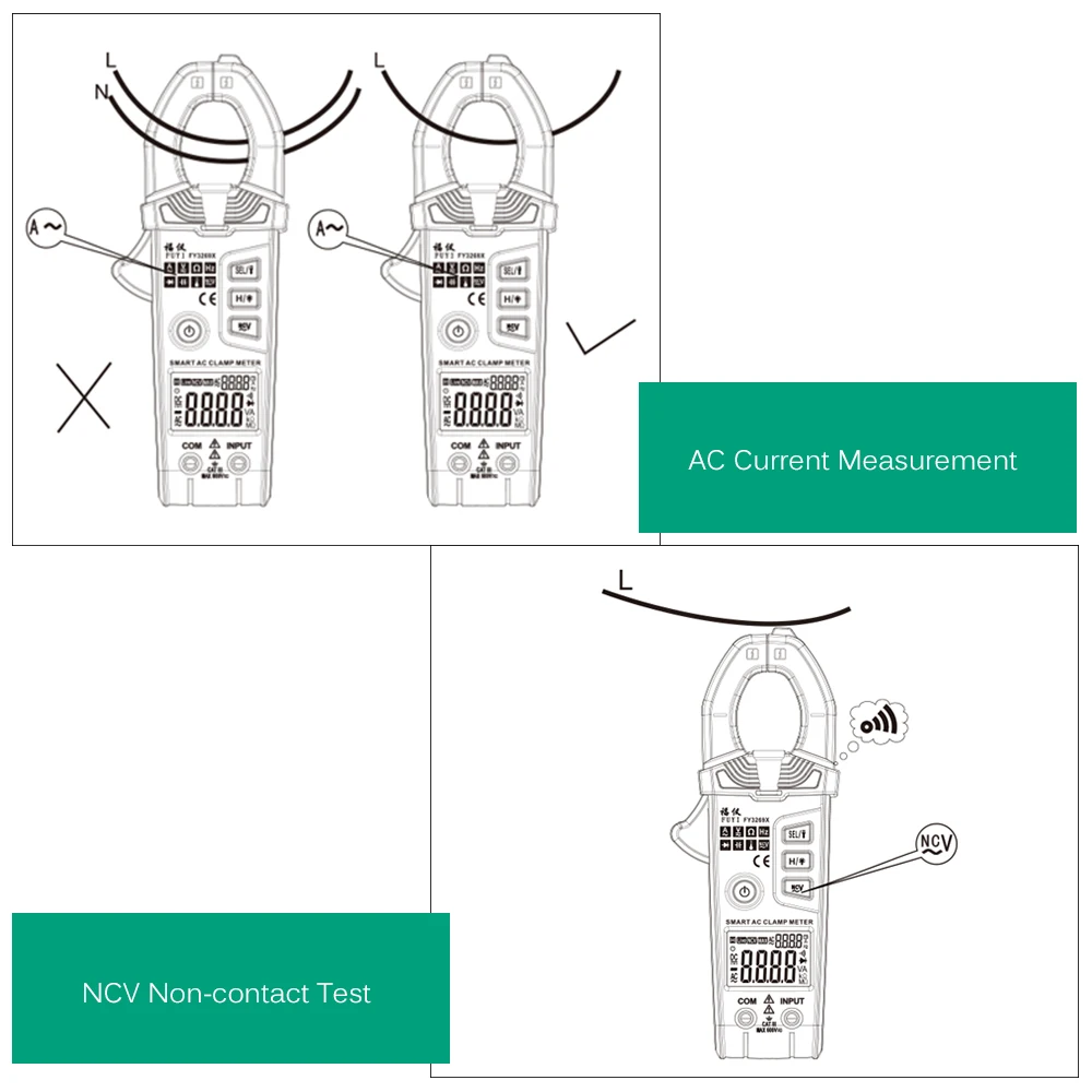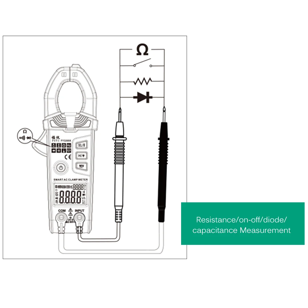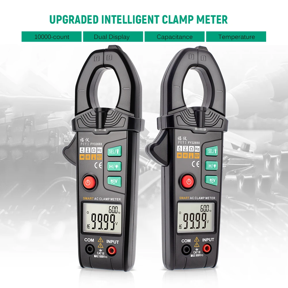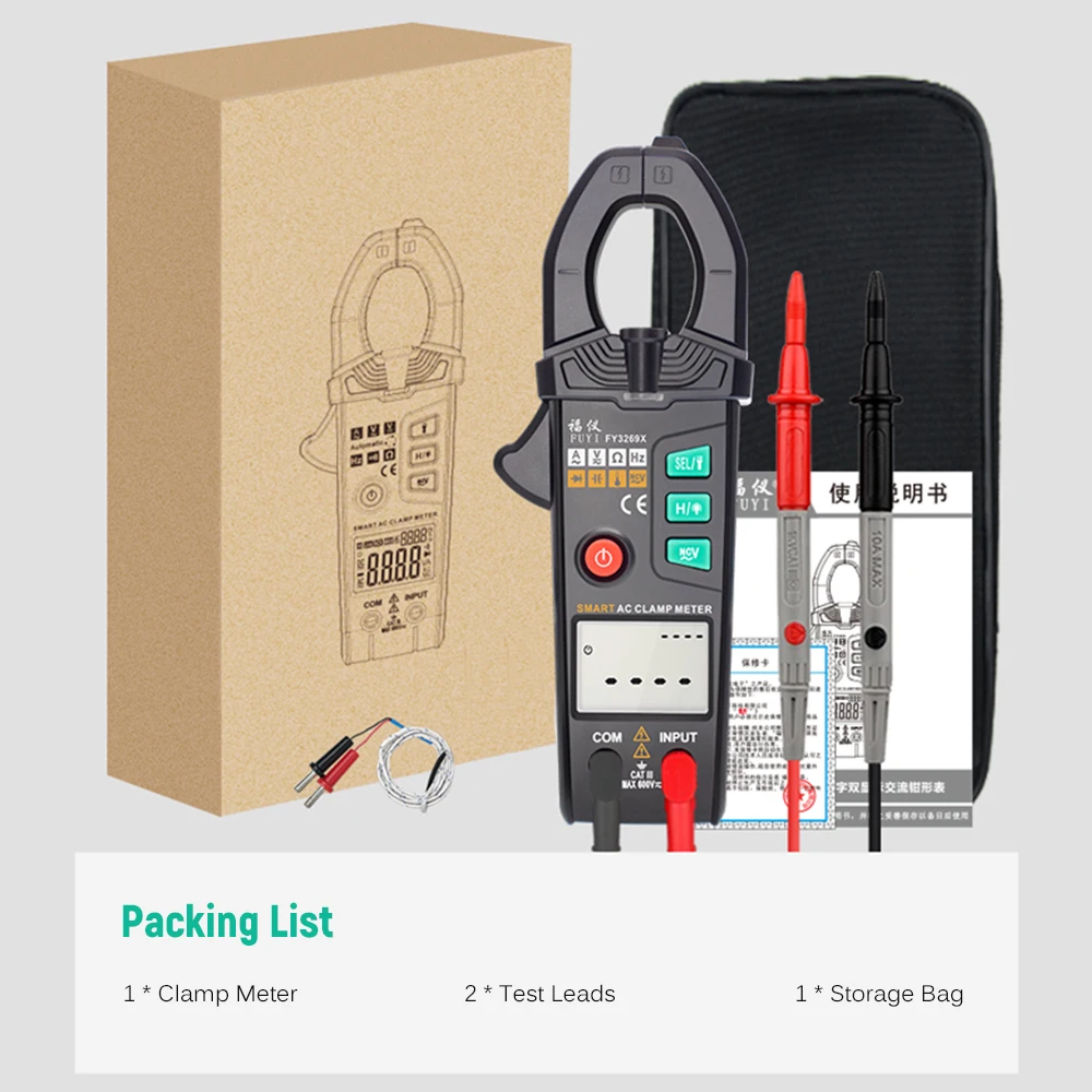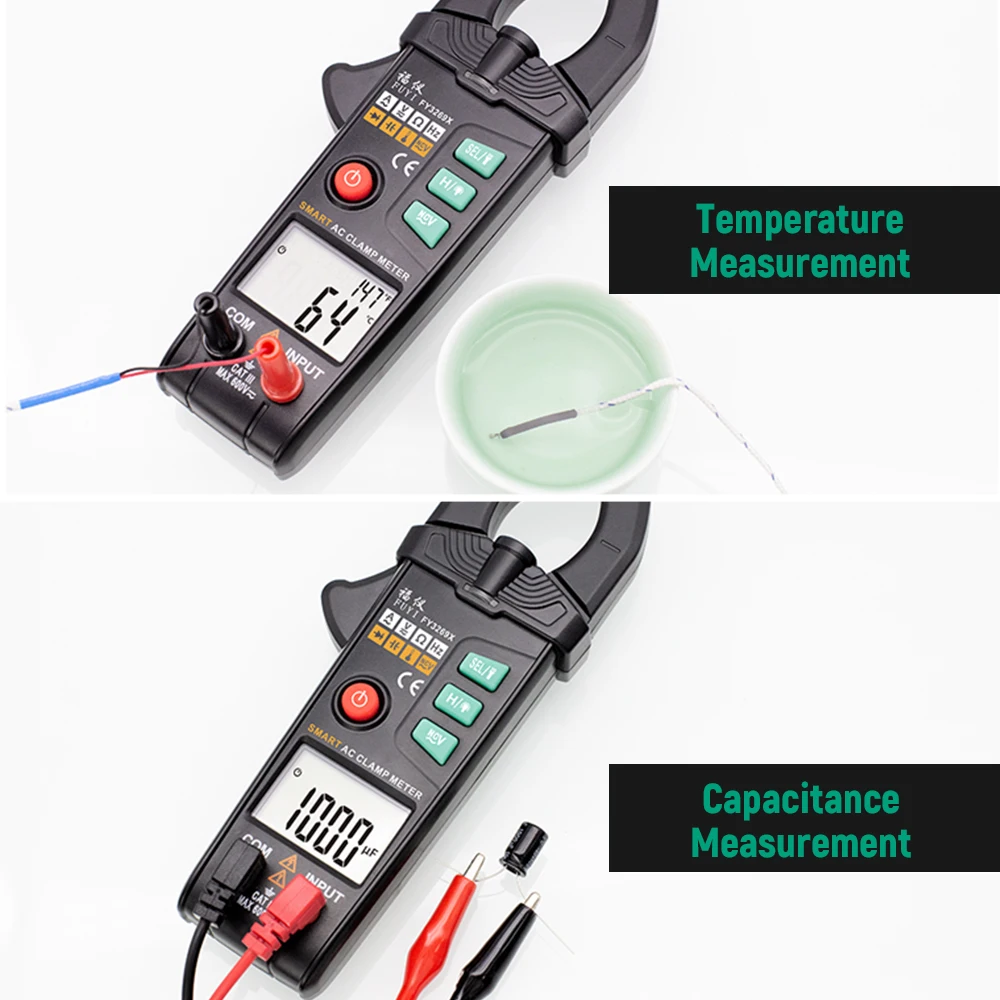 -Улучшенные характеристики: по сравнению с FY3269S, этот хомутовый метр добавляет характеристики дисплея 10000 подсчета, измерение емкости, измерение температуры и тест на диод, гораздо более комплексное.