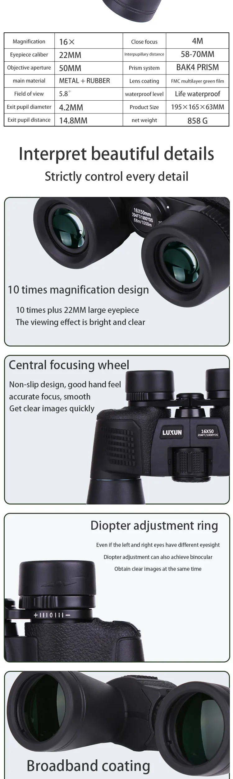 LUXUN 16X50 мощный бинокль для туризма, охоты, бинокль HD с высоким увеличением, lll, телескоп ночного видения