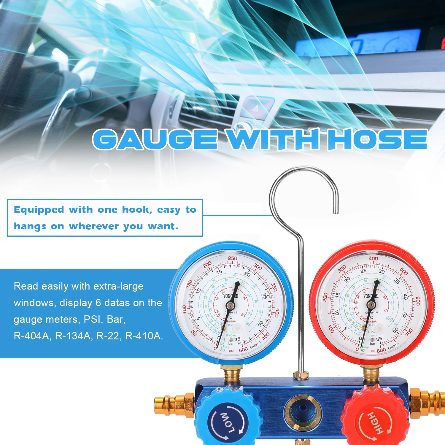 Легко читать с Экстра большими окнами, отображать 6 данных на измерительных метрах, PSI, Bar, R-404A, R-134A, R-22, R-410A.
