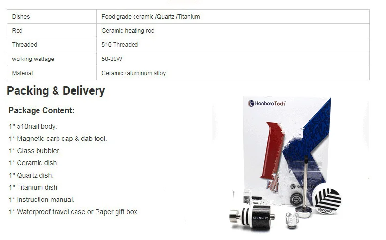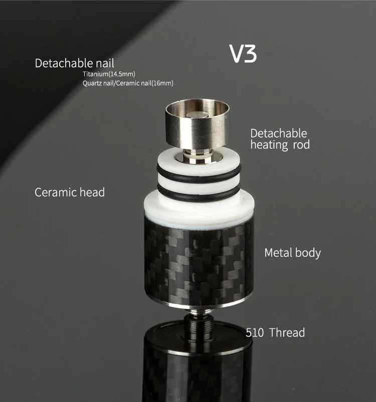 Название продукта: 510 гвоздь V3 Материал: алюминиевый сплав/керамика/стекло пира Характеристика: подходит ко всем Модам 510 thread Цвет: черный Вес: 100 г Гвозди: титан/керамика/кварц Нагревательный стержень: 4 мм, съемный Рекомендуемая мощность: 30 Вт-80 Вт Размер ногтей: XL Может использоваться на всех аккумуляторах И модах высокой производительности с резьбой 510. Стандартная посылка не включает элемент батареи.
