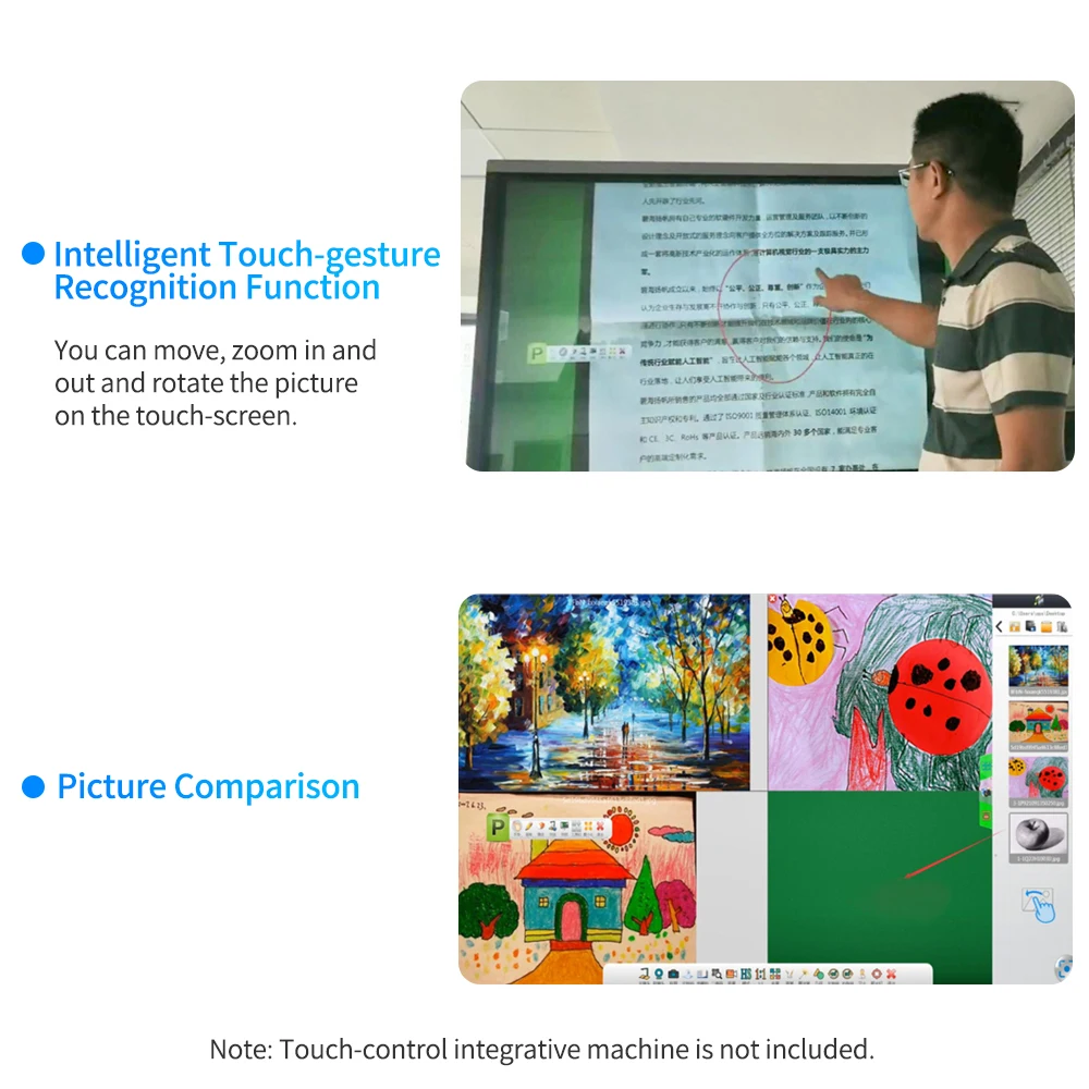 Программное обеспечение имеет богатые функции, такие как функции электронной доски, настройки, ручка для письма, ластик, замороженные, оснастки, инструменты, фото, видео рекордер, рисование простой геометрии, функция прожектора, сравнение изображений, поддержка функции сканирования документов, автоматическое обрезание, съемка и обработка документов.