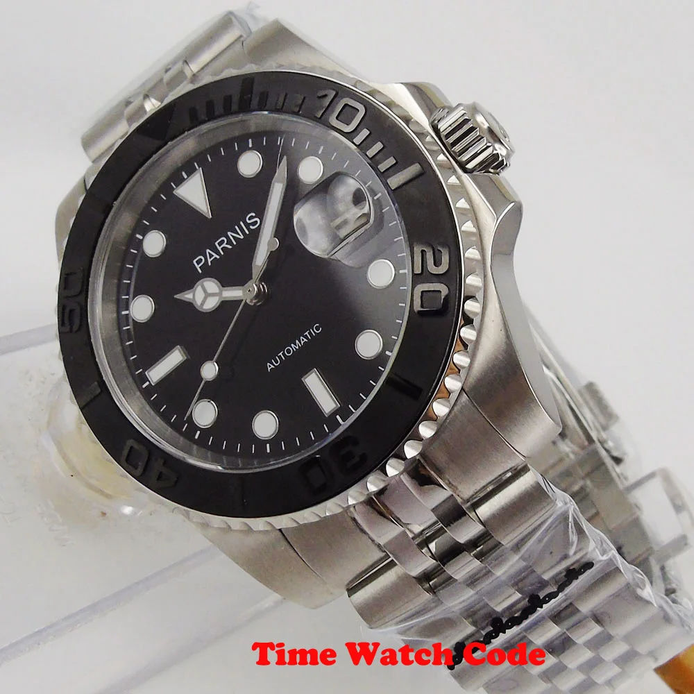 -- Механизм: Mingzhu 2813 Miyota 8215 механический автоматический механизм; -- Чехол Материал: 316L полностью нержавеющая сталь с керамический Безель; -Водонепроницаемость 3 АТМ; -- Чехол Размеры: 40 мм Диаметр; 14 м Толщина; -Циферблат: черный цвет; Светящиеся отметки и стрелки; Окошко даты в положении «3 часа»; -Размер ремешка: ширина 20 мм; -- Стекло: сапфировое стекло; -- Материал ремешка: нержавеющая сталь; Раскладная Пряжка;