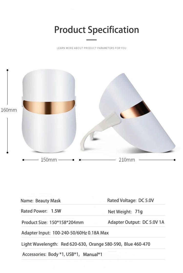 Specification: number of led lights:32 Product net weight :70g Product size :195*170*120mm Product material :ABS+PC Suitable for people: with an irregular diet,staying up late,sit in front of the computer and use cellphone frequently For skin: Spots 、Freckles 、acne、dull、dark、 yellow、large pores、coarse、sagging skin How to use: 1.Plug the USB connector at the end of the wire of your LED MASK. 2.clean your face ,wait till it dries. This makes it easier for light to penetrate your skin. 3.Put on your Mask . Make sure that you wear it comfortably. 3 Colors LED mask can solve stubborn skin problems: 1、Red light(620nm-630nm):whitening pale spot,tender skin and anti-wrinkle,repair damaged skin,smooth the fine wrinkles,shrink pores,hyperplasia of collagen. 2、Blue light(460nm-470nm):efficiently minimize and heal acne,Relax and restore balanced sensitive skin 3、Orange light(580nm-590nm):improve coarse skin and wrinkle,redness, fever , increase immunity. Included: 1*. LED Faical Mask 1*USB Cable 1* Manual